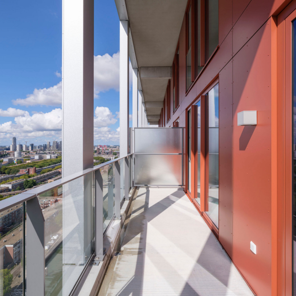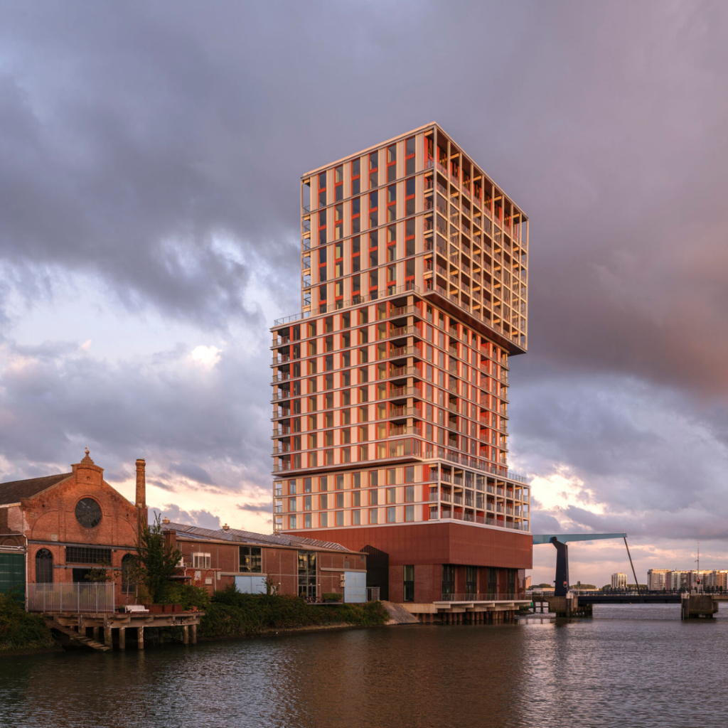 A Torre residencial inovadora de 74 metros de altura em 22 andares, abriga 142 apartamentos estilo loft com tipologias únicas, posicionados estrategicamente ao lado da ponte Piek tanto como marco quanto como convite para redescobrir esta parte de Roterdã.