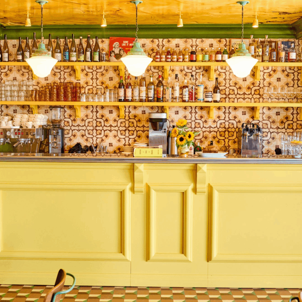 A equipe usou uma paleta de cores ensolarada para o interior com o bar pintado de um amarelo girassol impressionante.