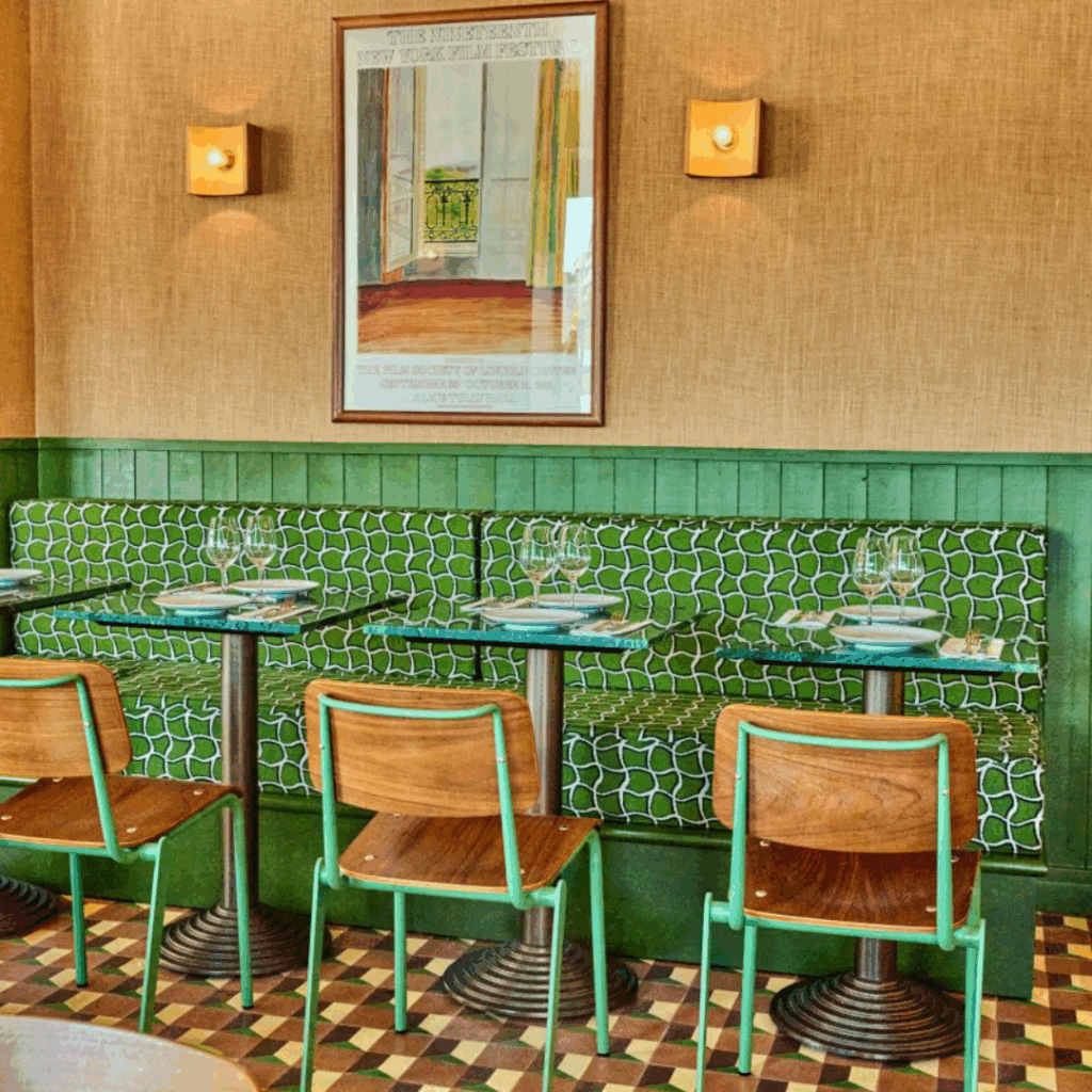 O designer Luke Edward Hall usou móveis antigos e feitos sob medida, mármore trompe l’oeil e papel de parede de juta para fazer os visitantes “se sentirem muito em casa” neste restaurante em Paris.