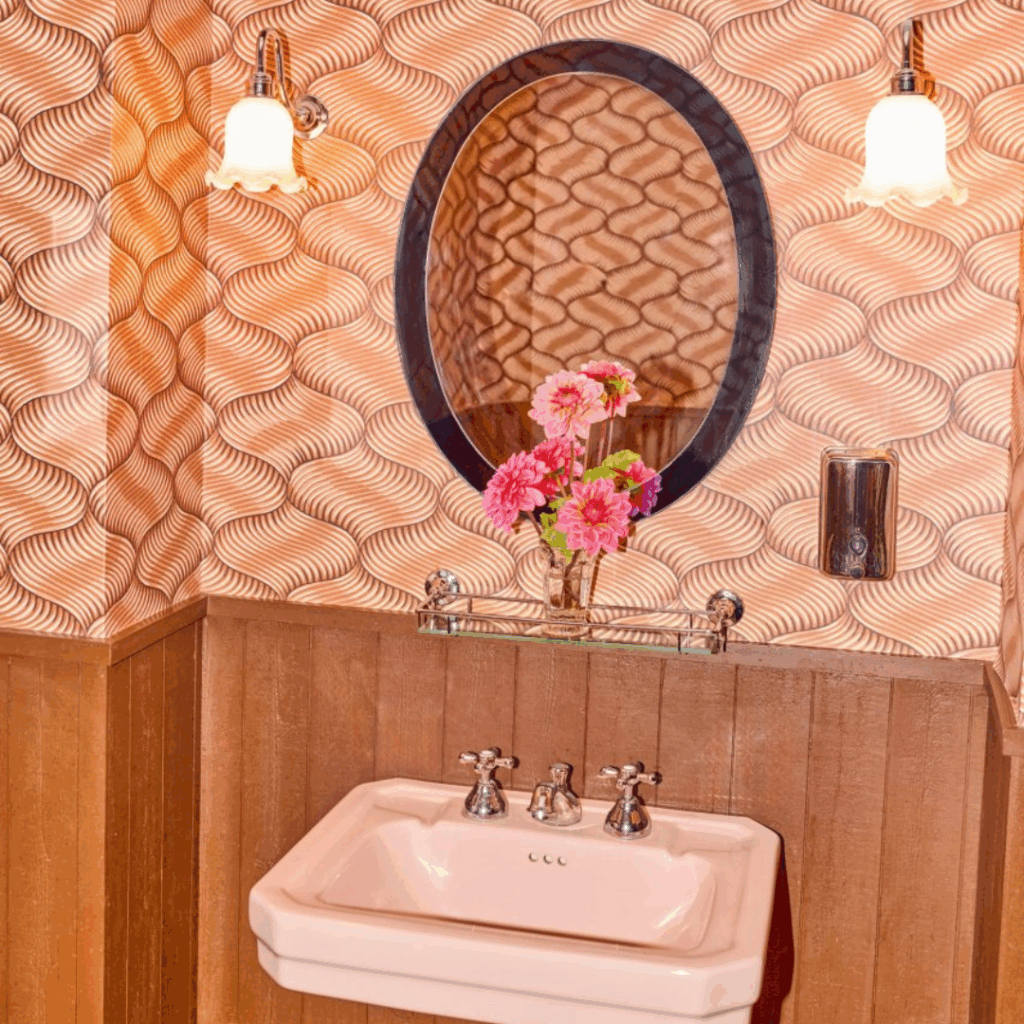 O teto do bar de mármore falso contrasta com o padrão geométrico vívido do piso, que tem uma paleta verde, marrom e amarela.