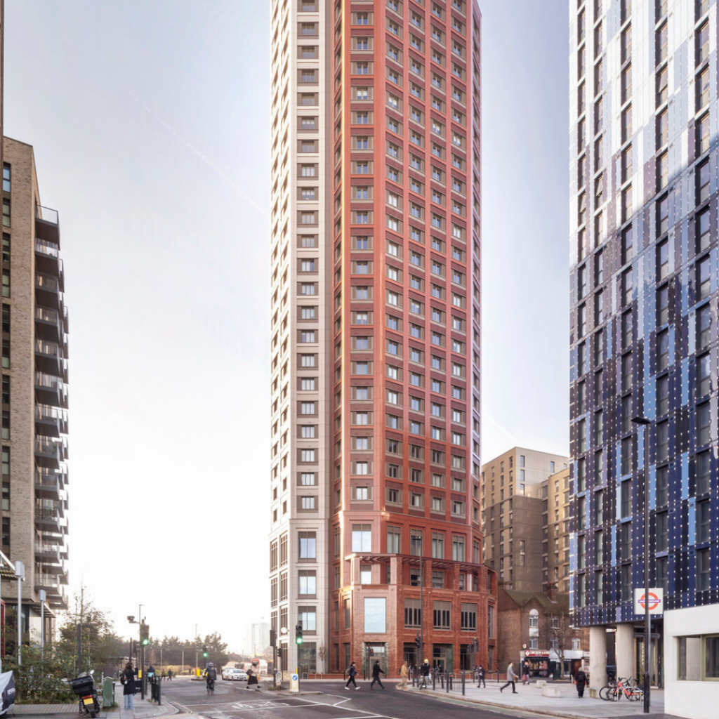 A torre é um co-living de 32 andares em North Acton, Londres, composta por 462 apartamentos-estúdio.