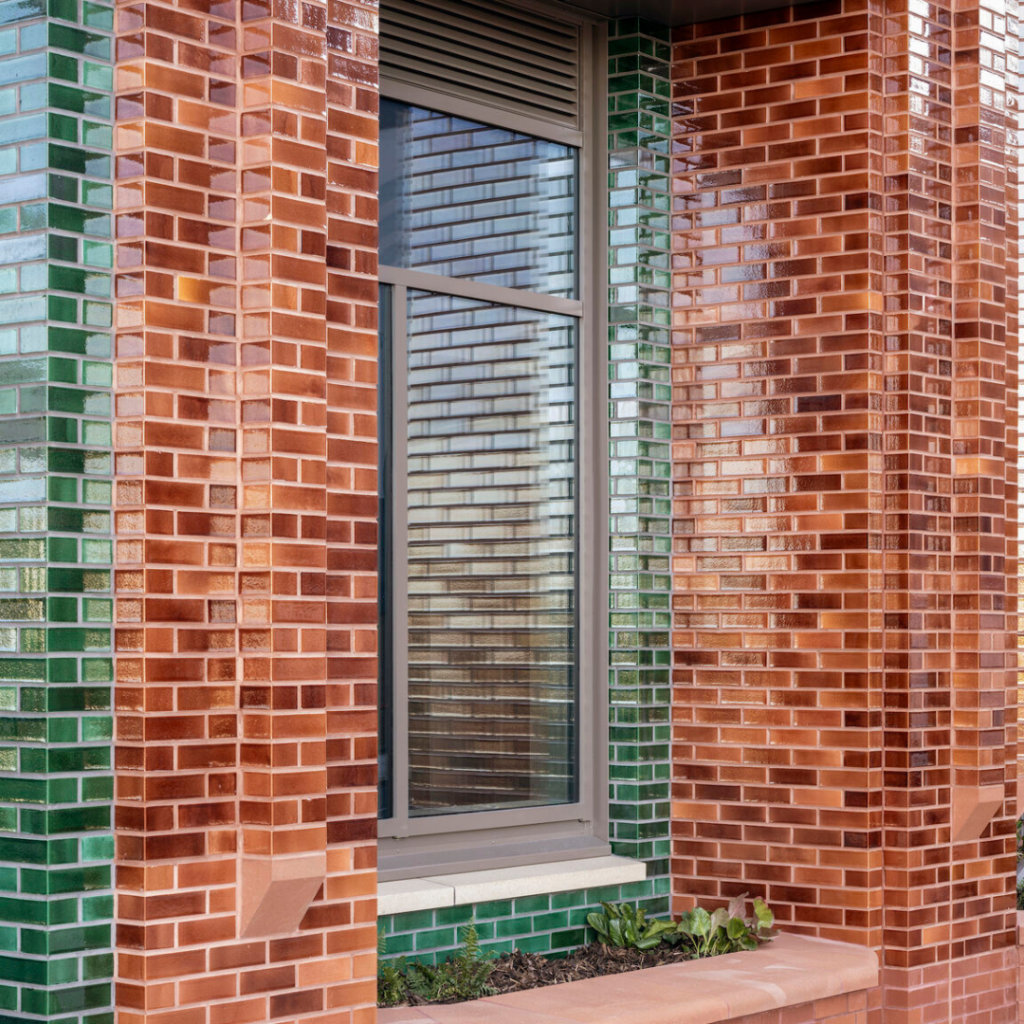 Tijolos vidrados são dispostos em composições facetadas com revelações profundas, introduzindo textura e sombra enquanto refletem a luz do dia.