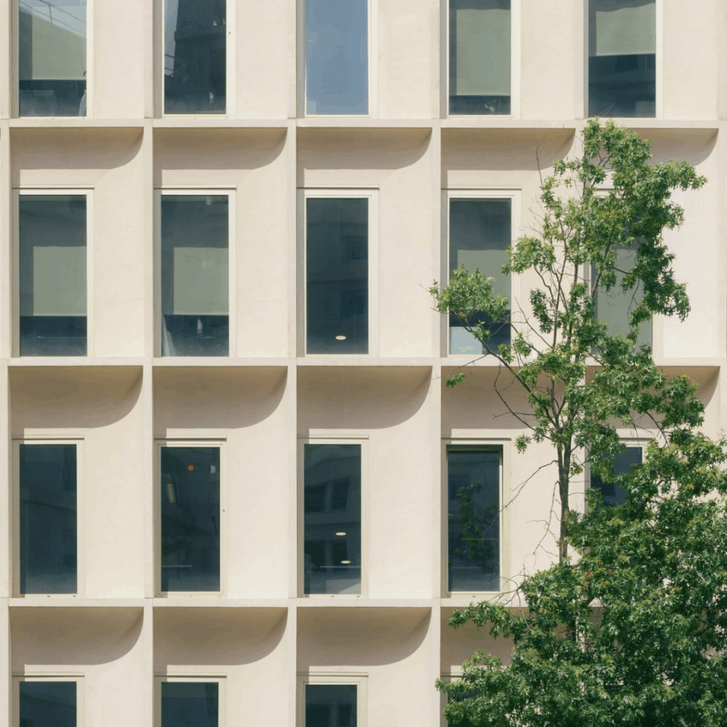 Uma estrutura em grade organiza as fachadas e cria coesão visual.