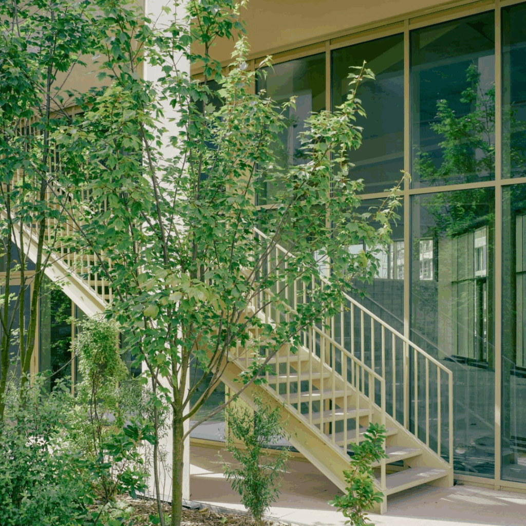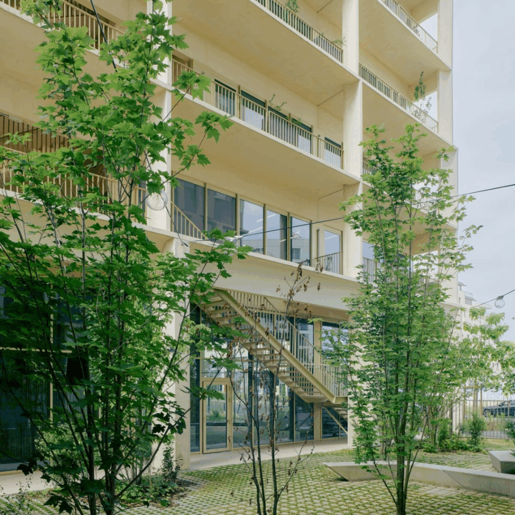 Estendendo-se por toda a largura do edifício, esta fachada oferece resfriamento eficaz no clima de Bordeaux e espaços agradáveis para interação e relaxamento.