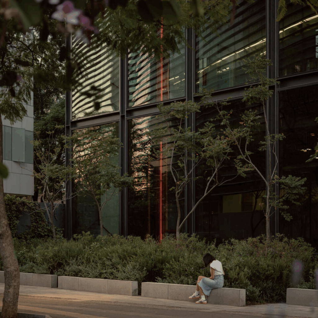 O design do edifício incentiva a conexão com a natureza, com grandes janelas, um jardim na cobertura e áreas de encontro ao ar livre que aprimoram a experiência geral do usuário.
