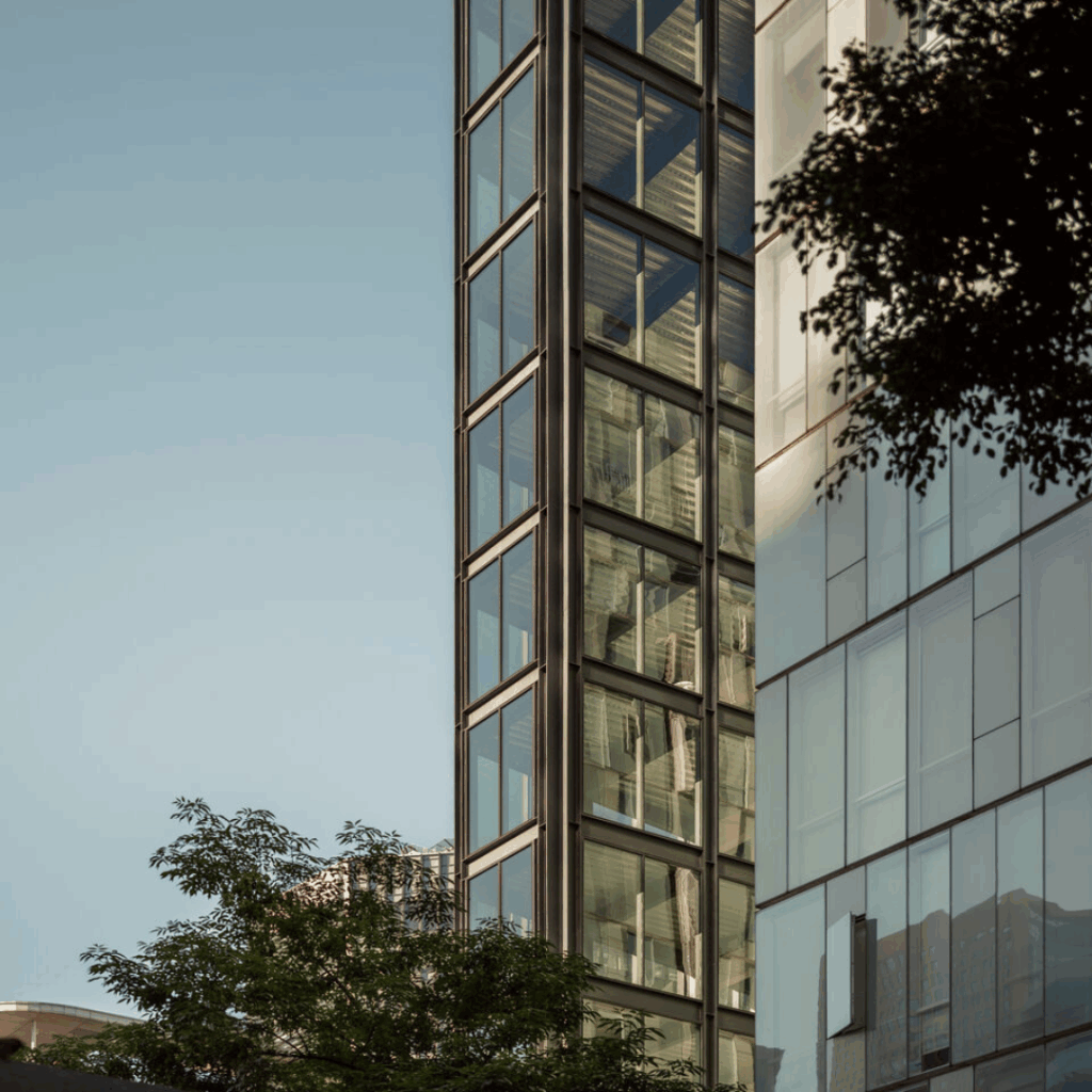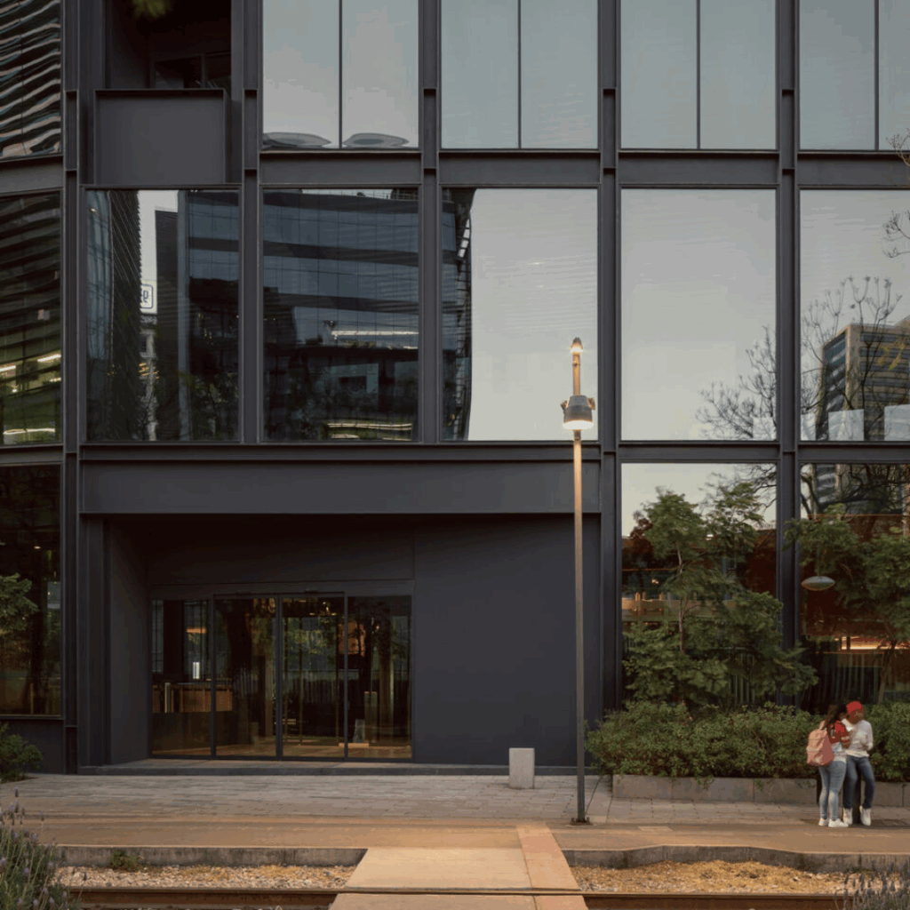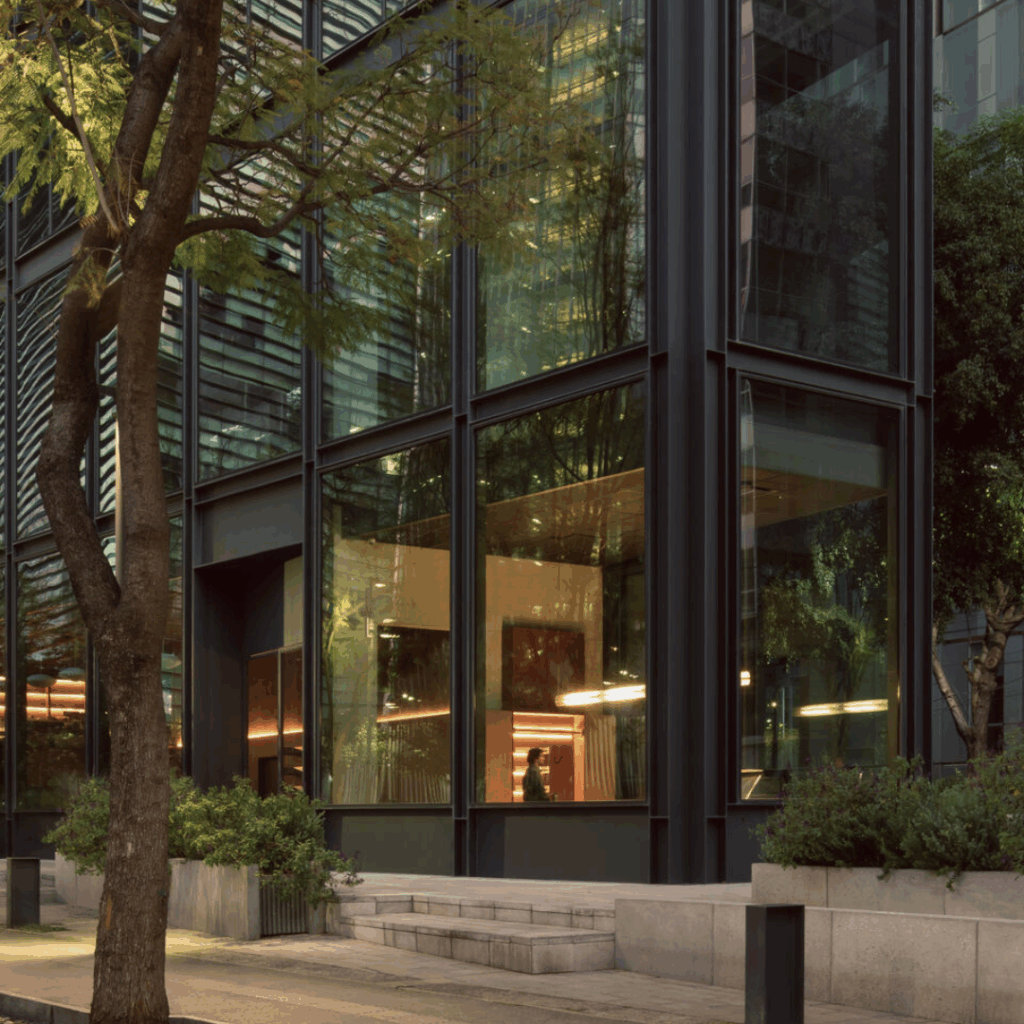 Fechadas no contexto urbano, essas fachadas abraçam predominantemente o envidraçamento, promovendo uma abundância de luz natural e conectando harmoniosamente o edifício ao seu entorno.