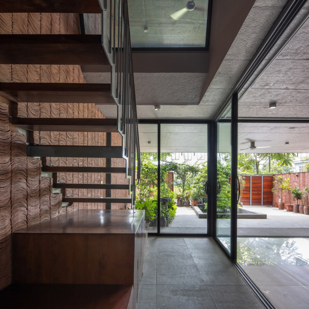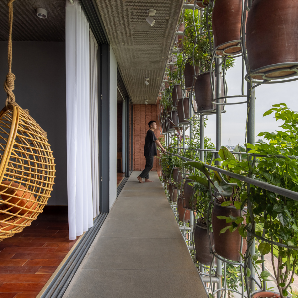 A frente e a parte de trás da casa são moldadas por um sistema de vasos suspensos de plantas em colunas infinitas que parecem voar.