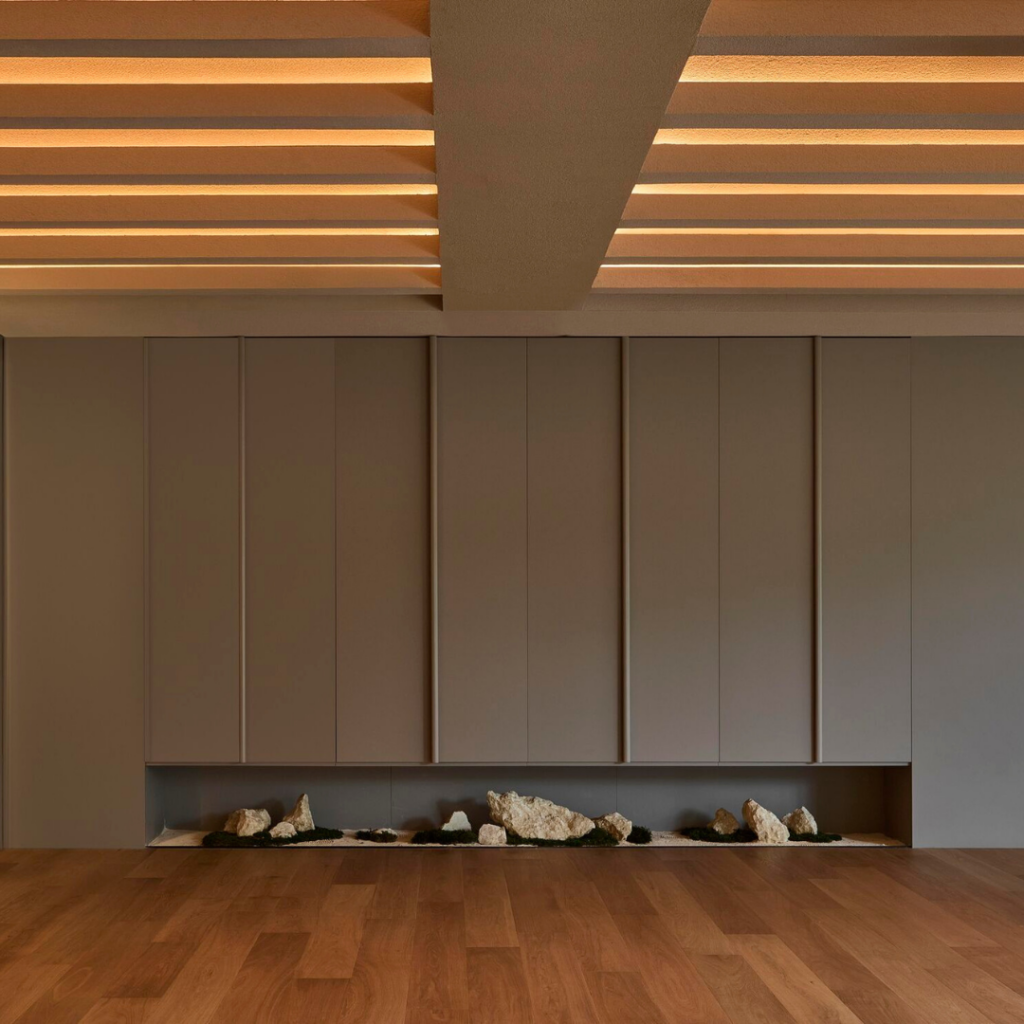 O design de iluminação foi concebido como um elemento sutil e de apoio, realçando a qualidade emocional do espaço, respeitando os ritmos naturais do corpo.
