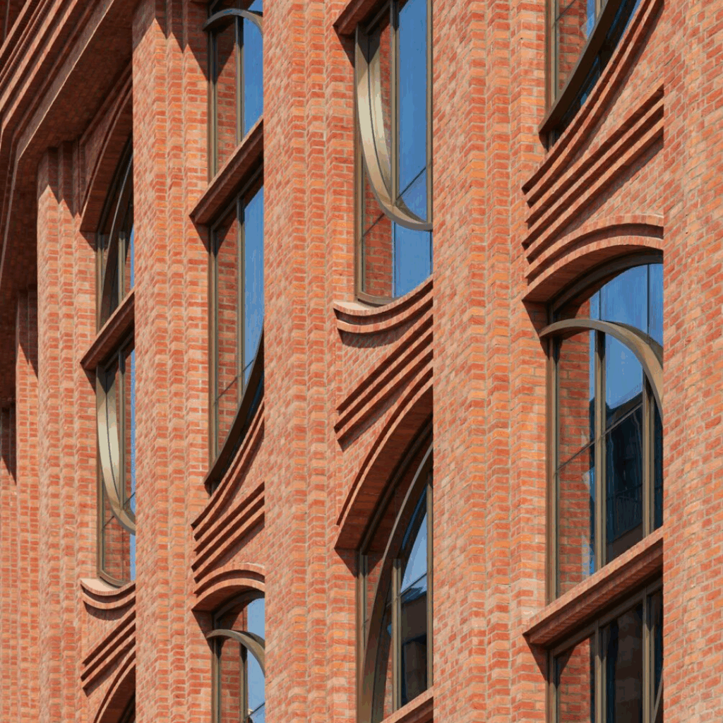 O alinhamento preciso das fiadas de tijolos, tanto horizontal quanto verticalmente, estabelece um ritmo arquitetônico unificado e harmonioso.