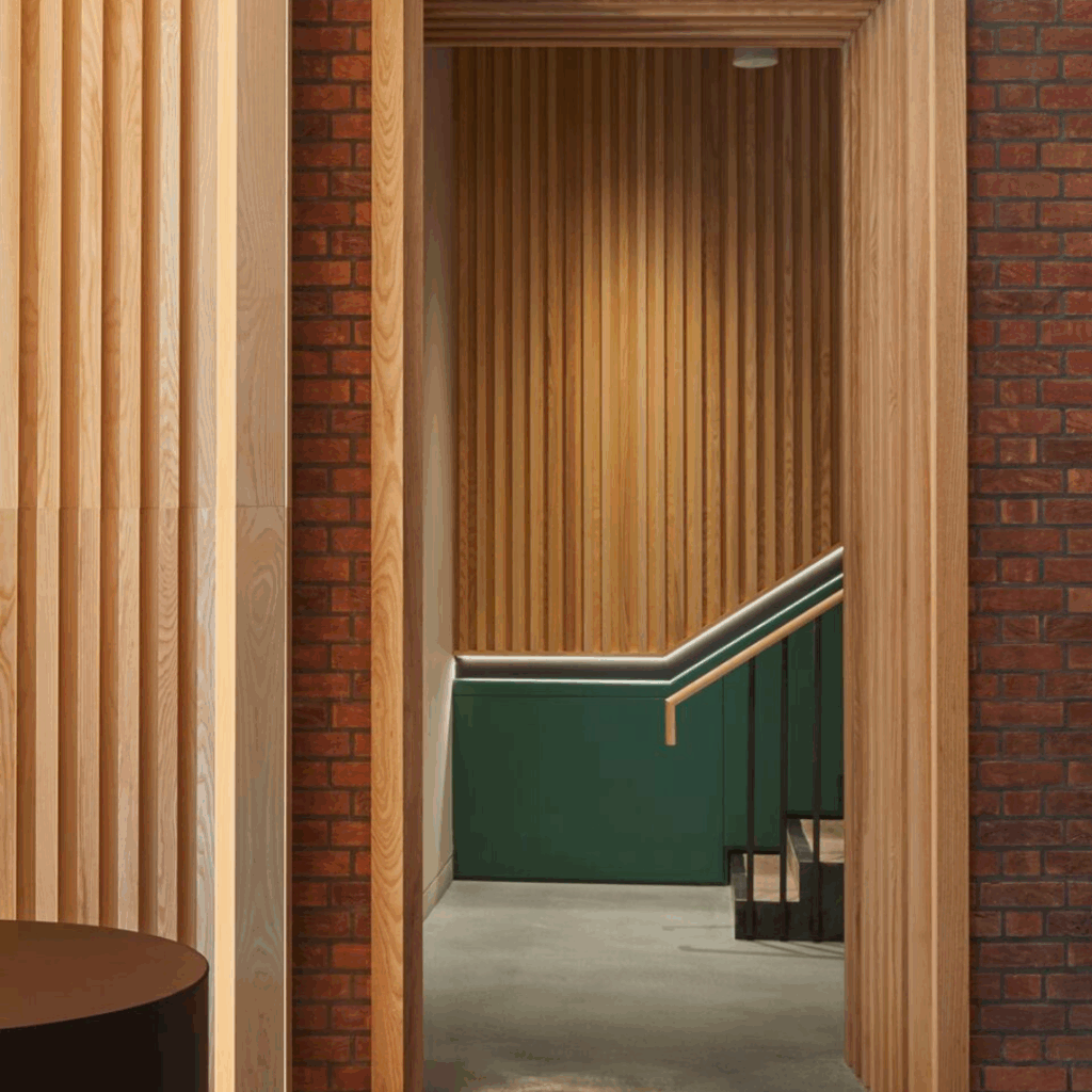 O uso de painéis esculturais de madeira no interior do térreo cria uma entrada acolhedora e acolhedora na área de recepção.
