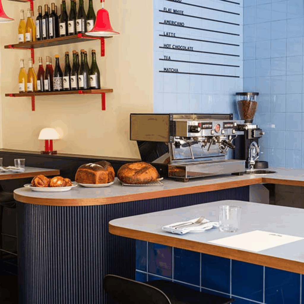 O bairro de Camberwell, em Londres, recebeu uma nova e iluminada padaria de bairro cujo nome amigável combina com interiores primários lúdicos contrastando vermelho e azul.