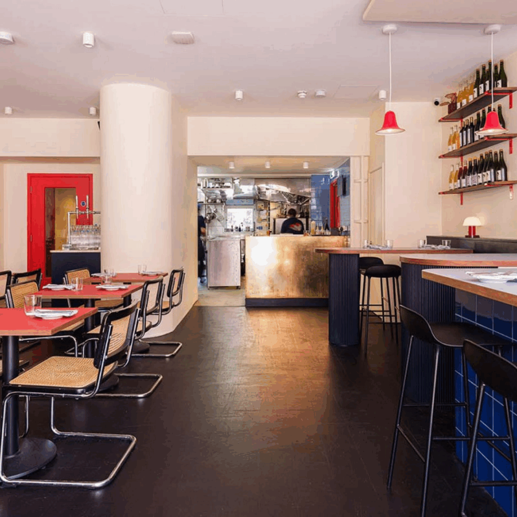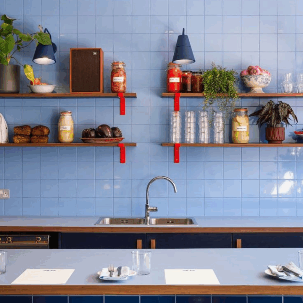 Os três tons ousados encontram seu espaço com confiança no interior, onde o azul-claro é novamente usado no balcão do bar e nos azulejos brilhantes das paredes, enquanto as prateleiras e os tampos das mesas em carmesim adicionam contraste.