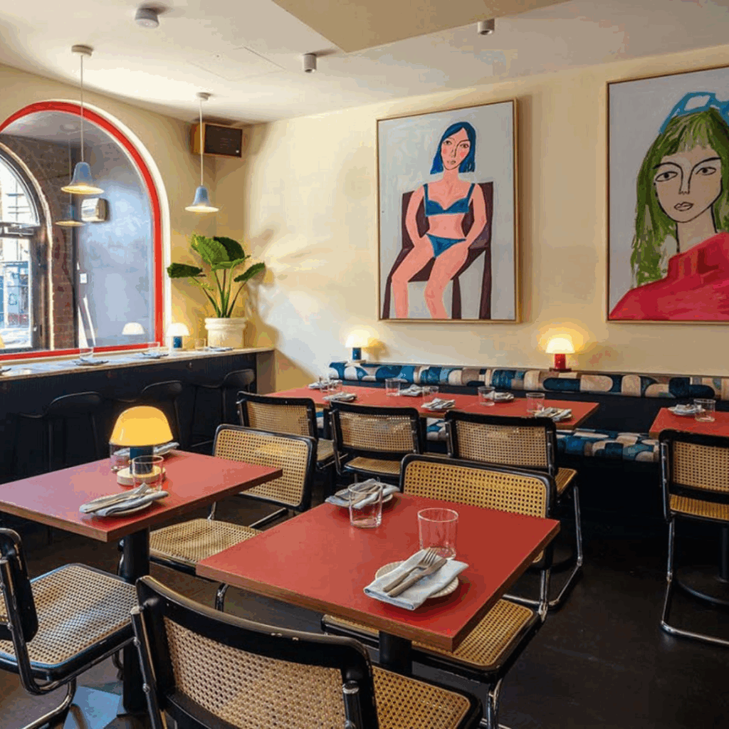 O café e restaurante londrino é uma criação de Jo Lavender e Rob Newlan, com interiores vibrantes de Stephen Harty e Michelle Kelly e a arquitetura de Harty & Harty Architects.