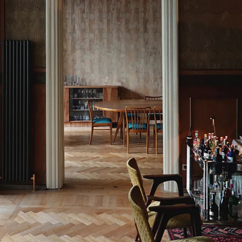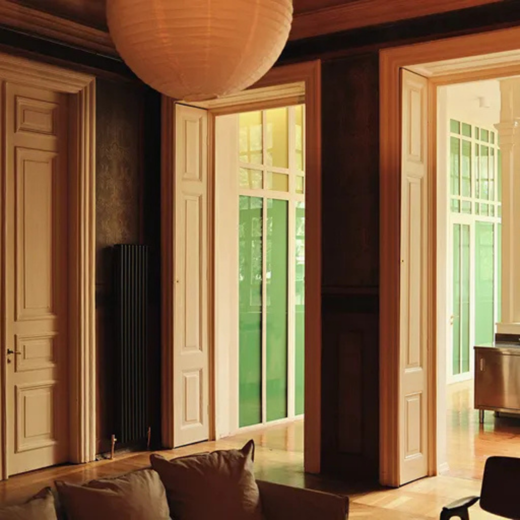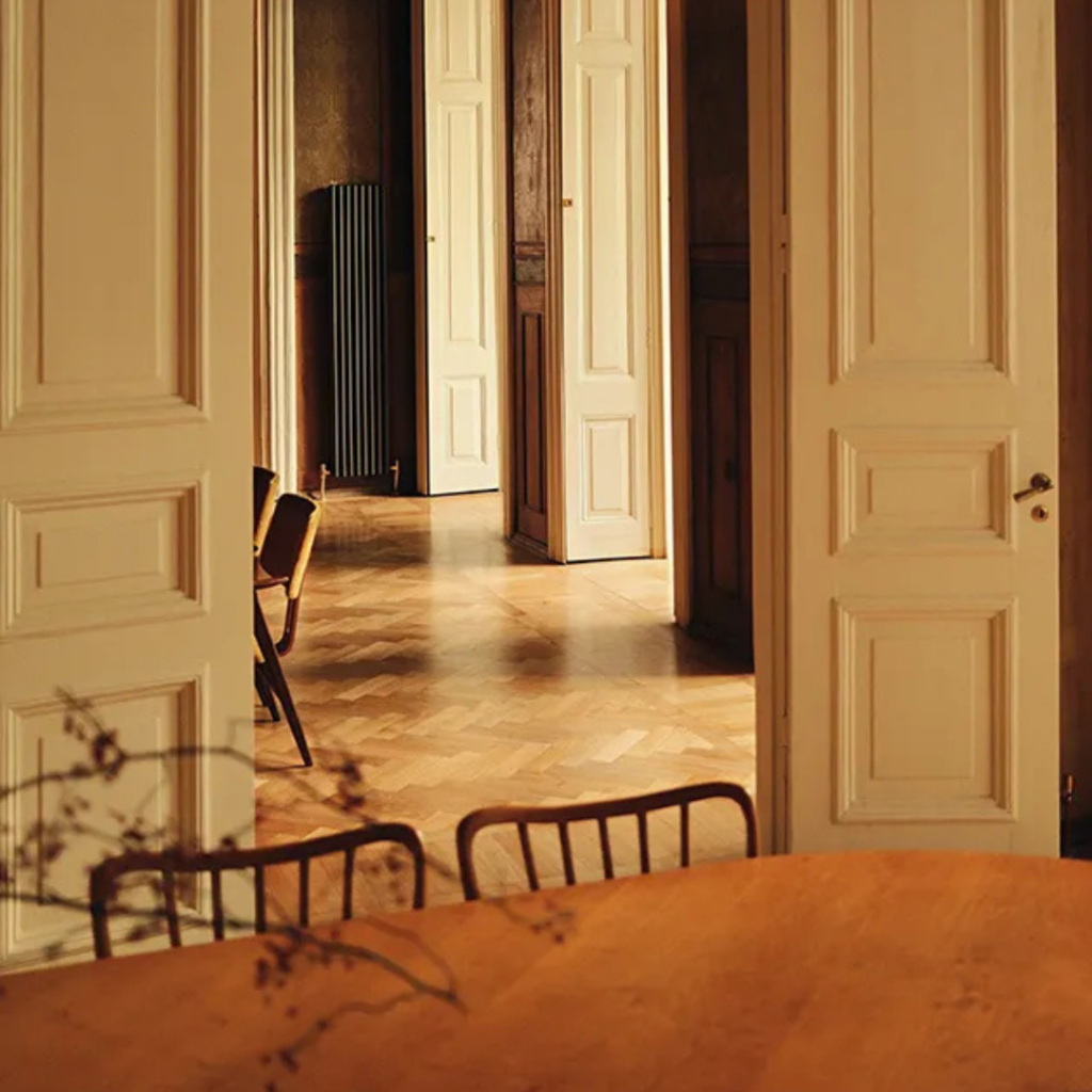 Pisos originais de parquet e tetos altos ancoram o espaço, enquanto portas duplas altas criam conexões visuais fluidas e uma sensação suave de cerimônia de cômodo em cômodo.
