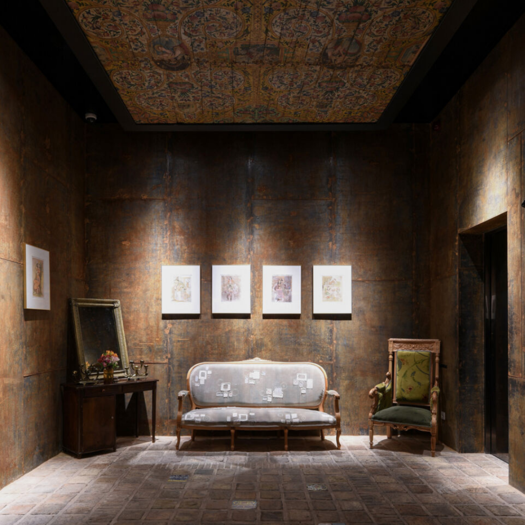 A experiência da presença começa com o “Hashti”, uma atmosfera sombria e sólida como uma pequena galeria de arte para exibir obras de artistas iranianos.