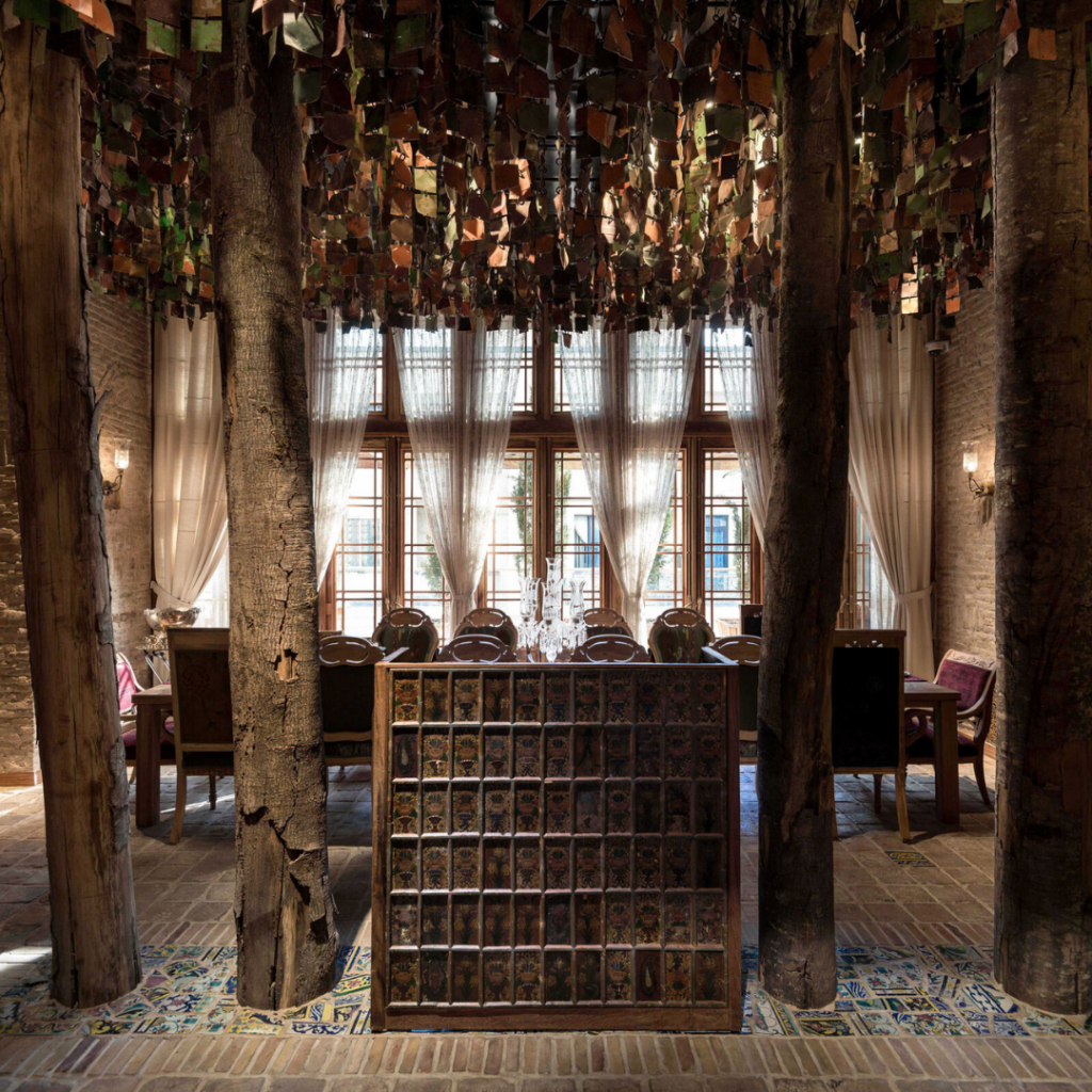A luz da manhã passando pelas folhas metálicas das árvores no “Hayat Khaneh” lembra da entrada do pátio central do outro lado de um corredor escuro.
