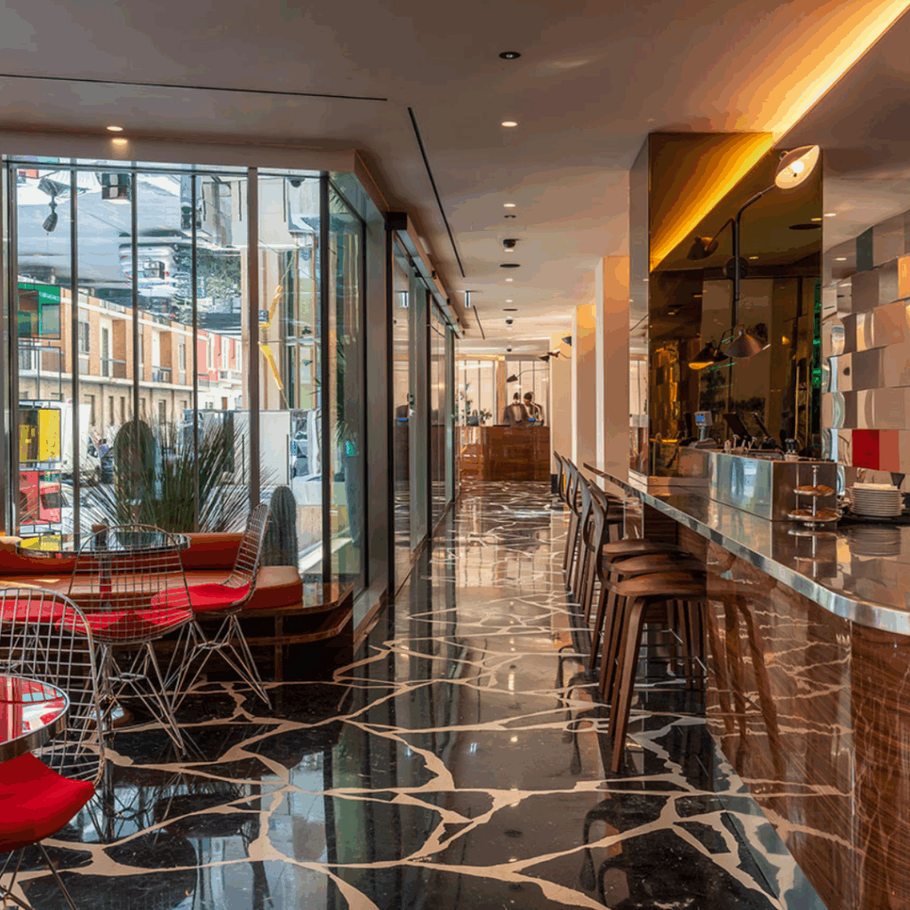O Espresso Bar, no nível do solo, liga a propriedade à rua vibrante.