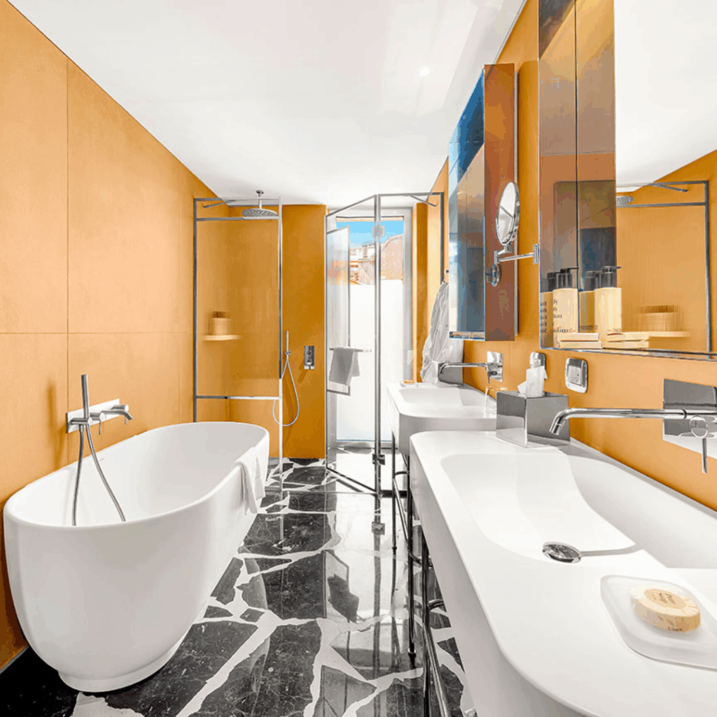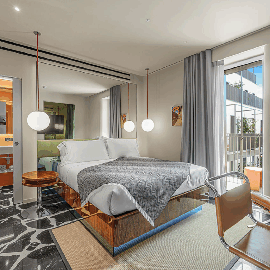 Os 88 quartos, incluindo quatro suítes distintas, são renderizados em madeira de nogueira brilhante embutida, paredes espelhadas, pingentes esféricos de grandes dimensões e toques de cores cuidadosamente escolhidas, transportando os espaços para outro tempo um pouco mais descolado.