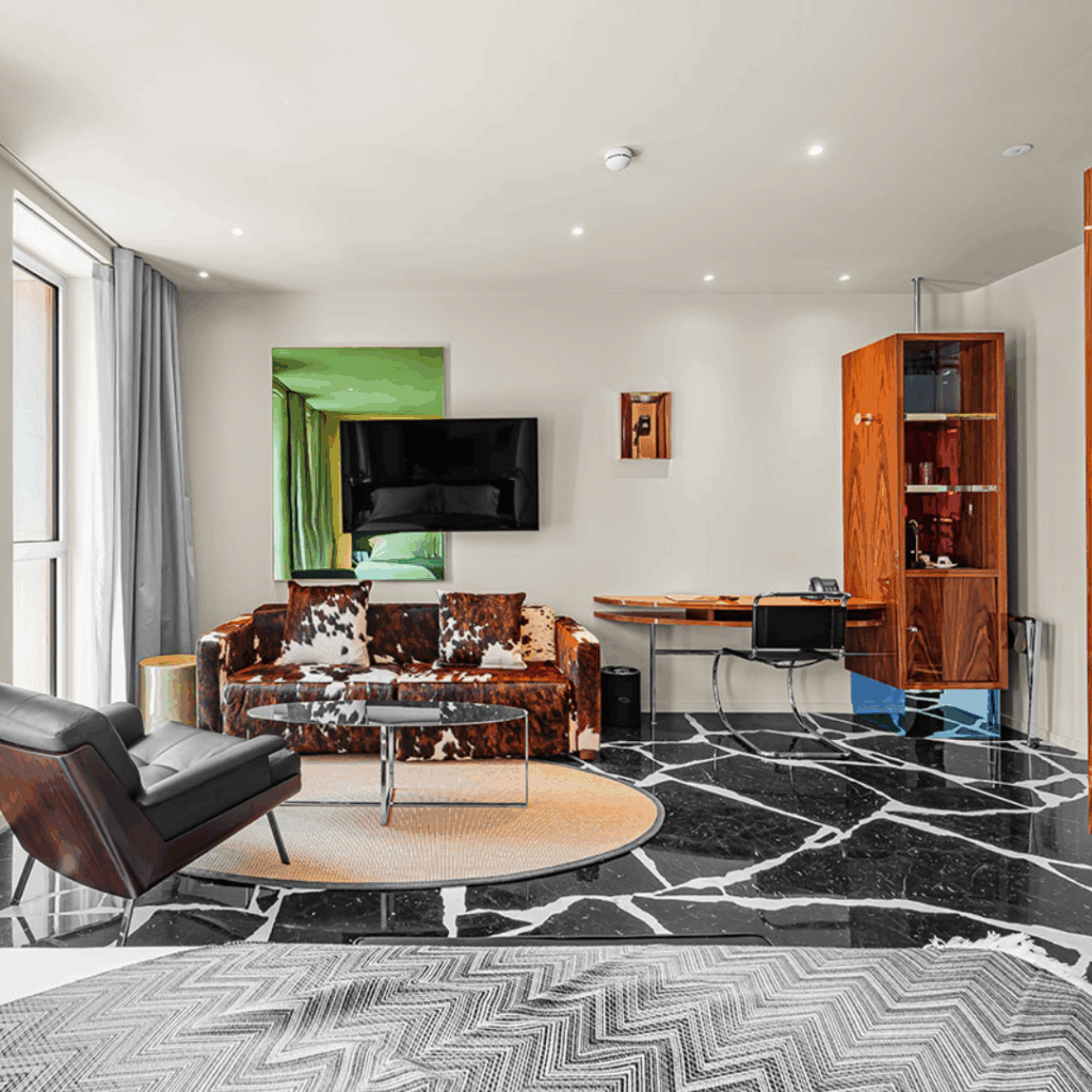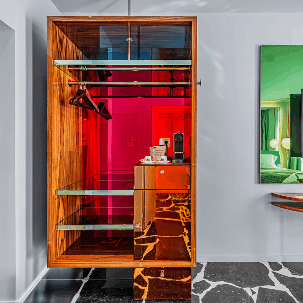 O hotel reflete esse ecletismo, mas em uma paleta coesa de materiais nobres, superfícies laqueadas brilhantes e cenários coloridos e reflexivos.