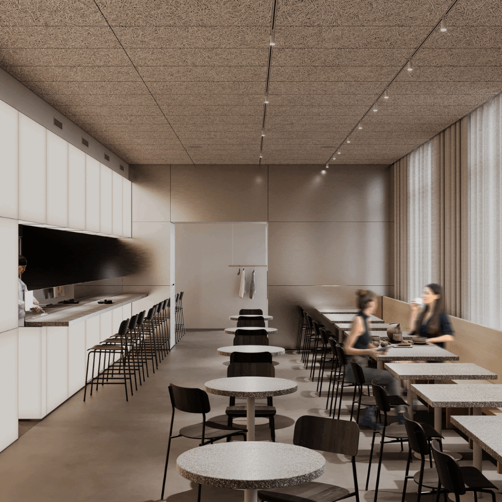 Acima, os painéis acústicos do teto garantem que o espaço permaneça sonoramente confortável durante os horários de pico, absorvendo o excesso de ruído e se misturando visualmente à arquitetura.