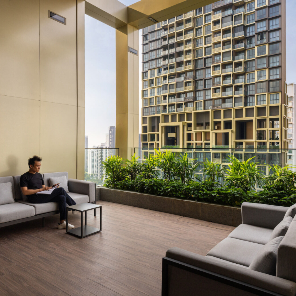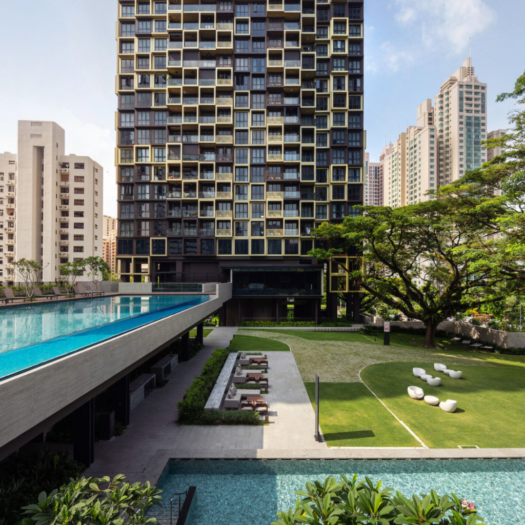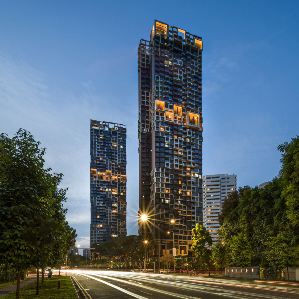 O design da fachada também chama atenção para as áreas comuns de ambas as torres, que incorporam áreas verdes características dos empreendimentos residenciais de Singapura.