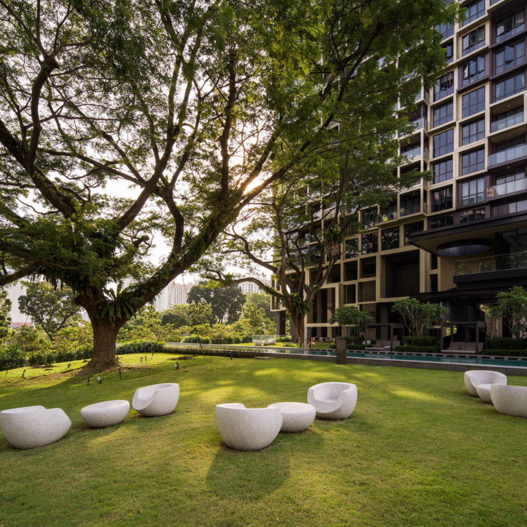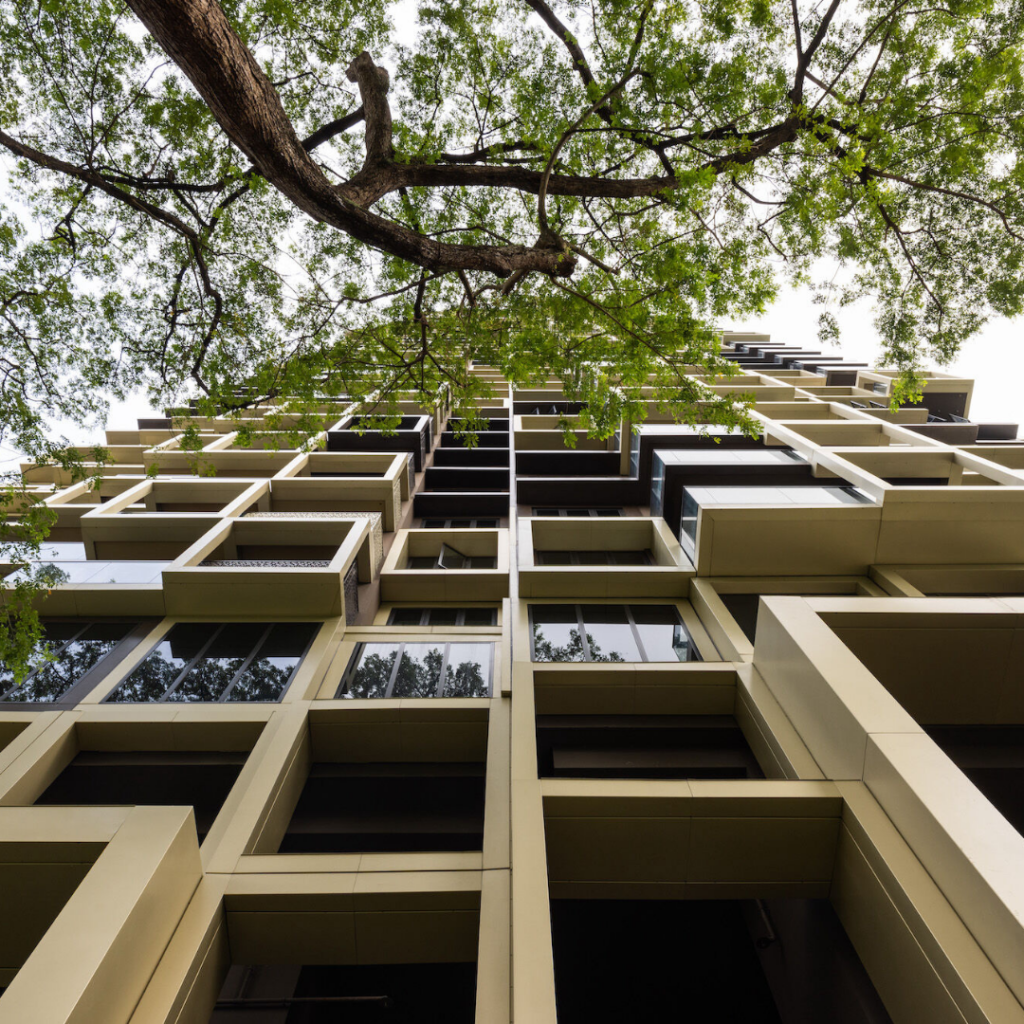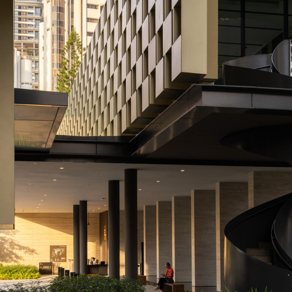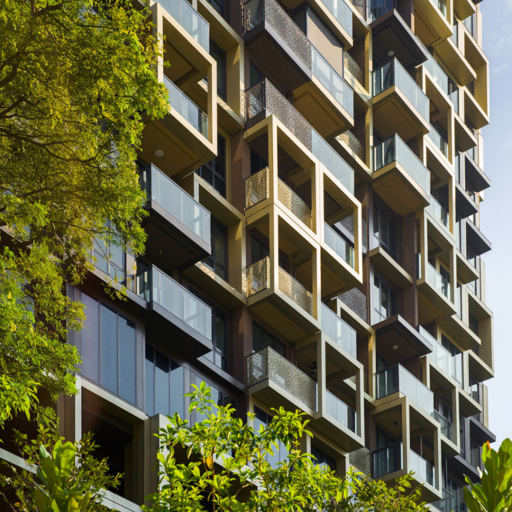 O design da fachada também chama atenção para as áreas comuns de ambas as torres, que incorporam áreas verdes características dos empreendimentos residenciais de Singapura.
