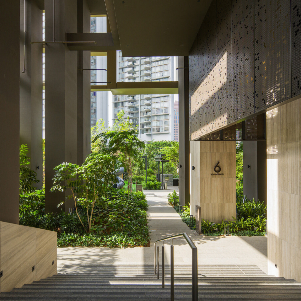 A estratégia ambiental do projeto combina construção pré-fabricada com design climático passivo, adequado ao contexto tropical de Singapura.