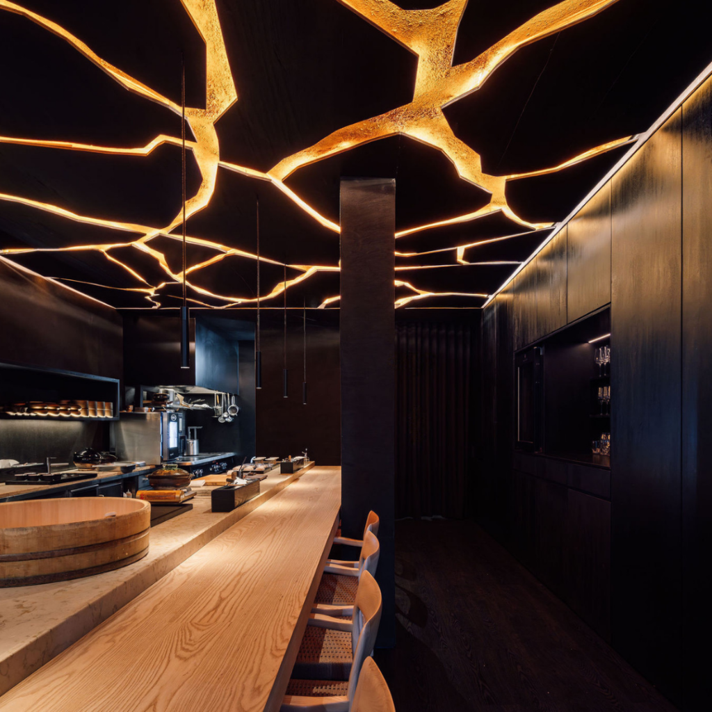 Concebida como um plano escuro contínuo, é intersectada por fissuras douradas irregulares inspiradas na arte japonesa do kintsugi.