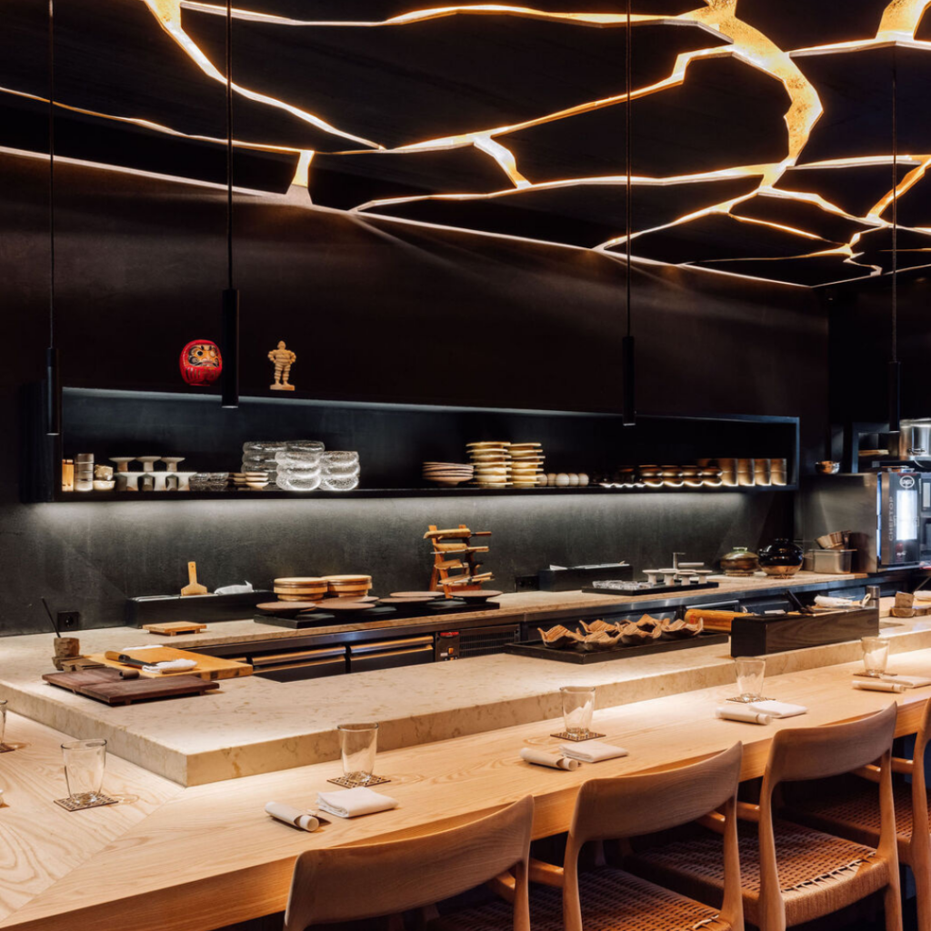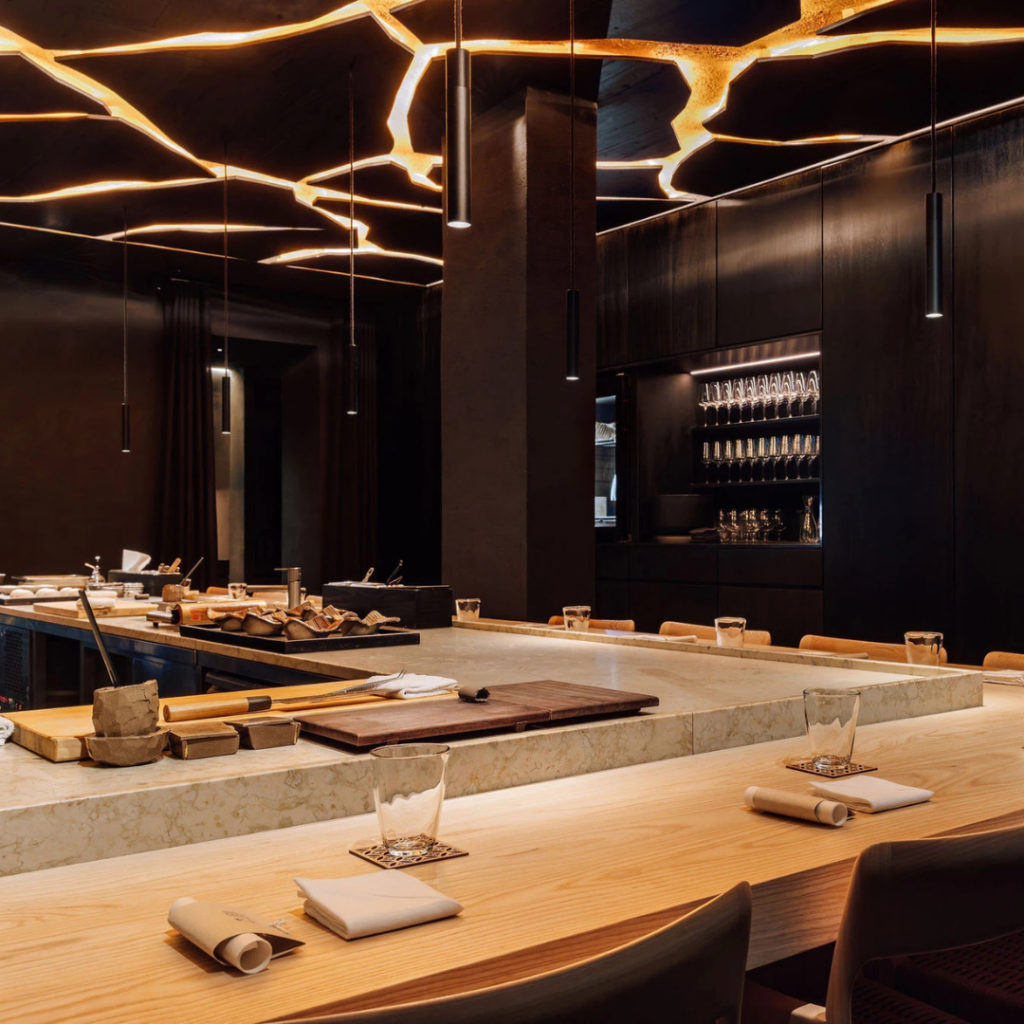 Mais do que um gesto gráfico, o teto se torna um elemento ativo na formação da experiência gastronômica, acompanhando o ritmo da refeição e marcando transições, pausas e momentos de intensidade.