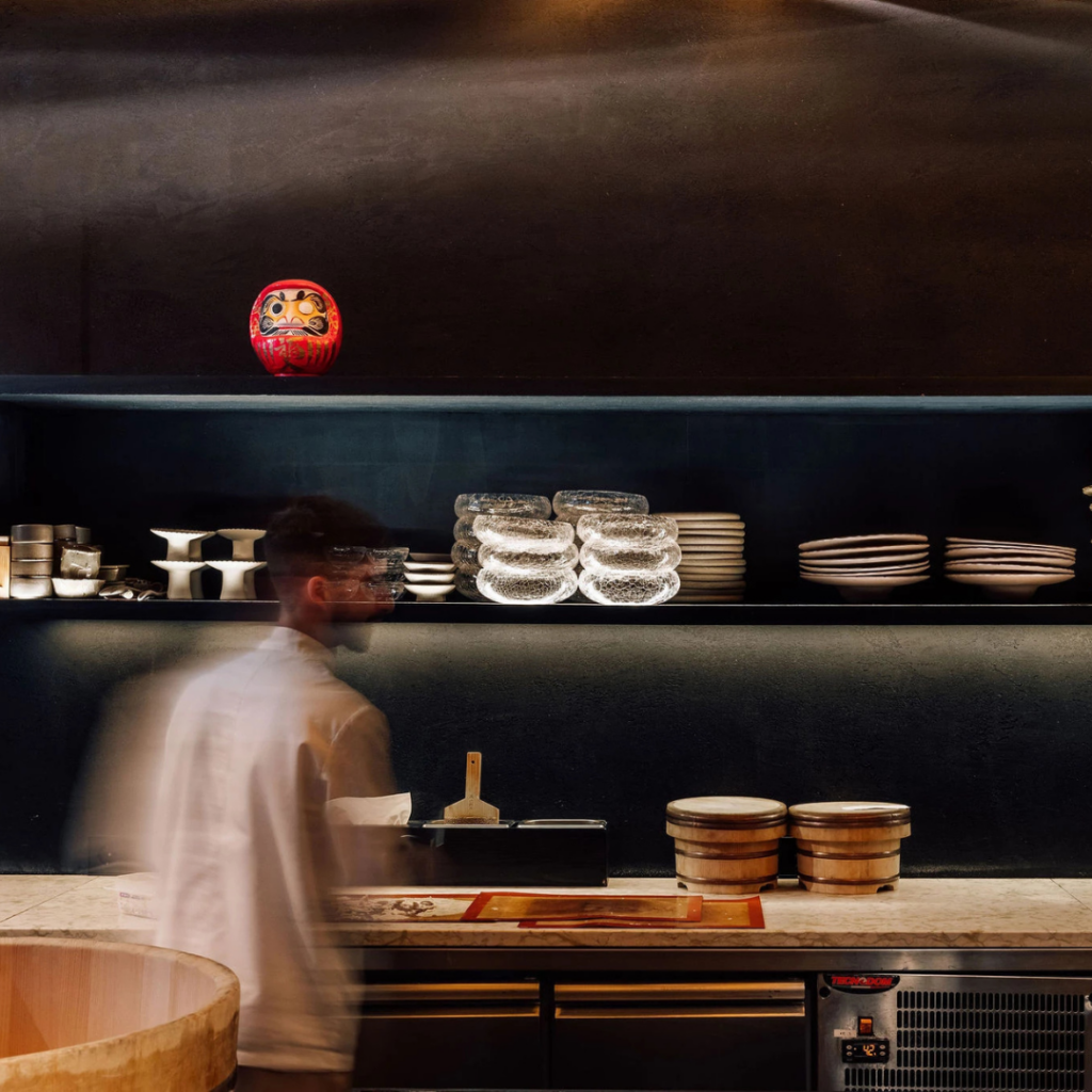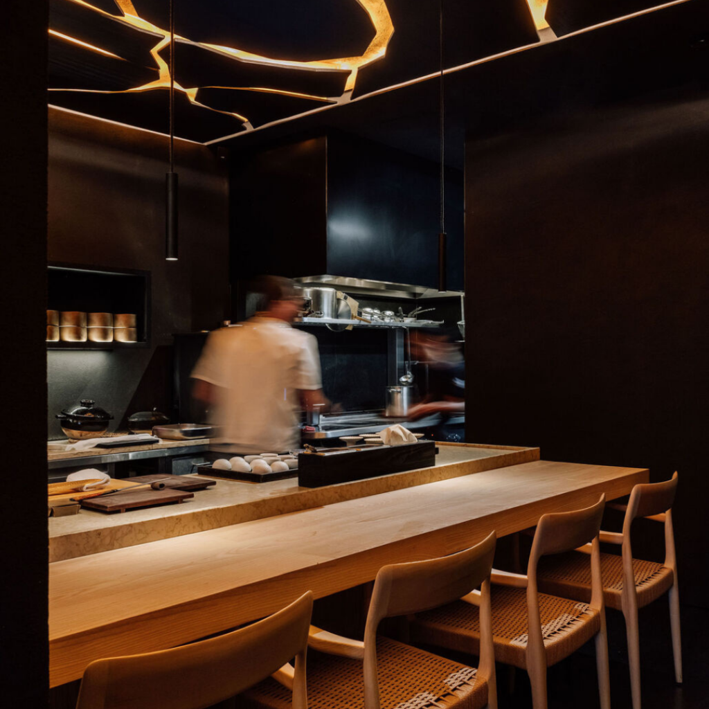O projeto intensifica essa lógica, concentrando a experiência em torno de um único bar contínuo com 12 assentos.