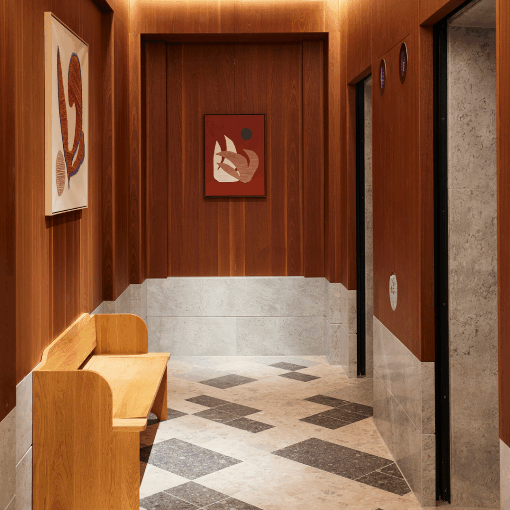 O saguão continua essa narrativa material com um bar de mogno, mármore e cobre, encimado por um suporte personalizado de vidro de cristal e níquel.