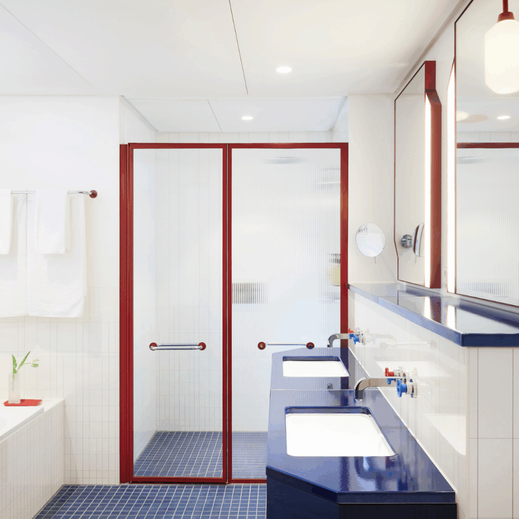 Os banheiros demonstram inovação funcional por meio de torneiras vermelhas e azuis que simplificam a operação para hóspedes internacionais.
