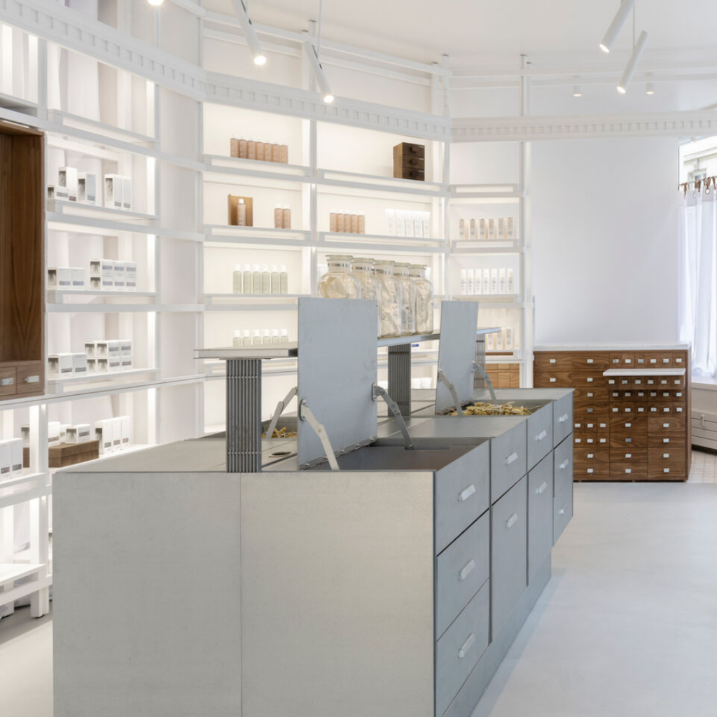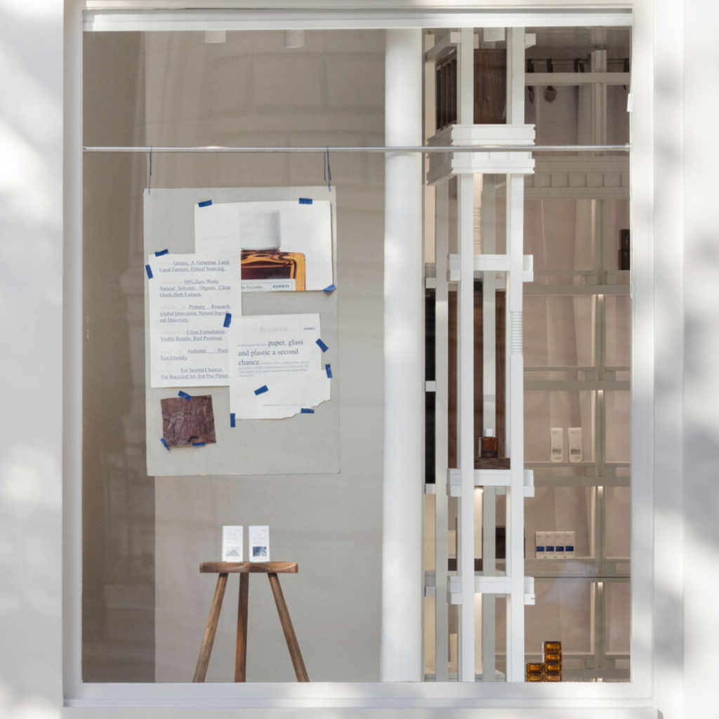 Dentro da loja, uma versão mais refinada do sistema de prateleiras ‘Nissos’ está exposta, projetada com proporções mais delicadas.