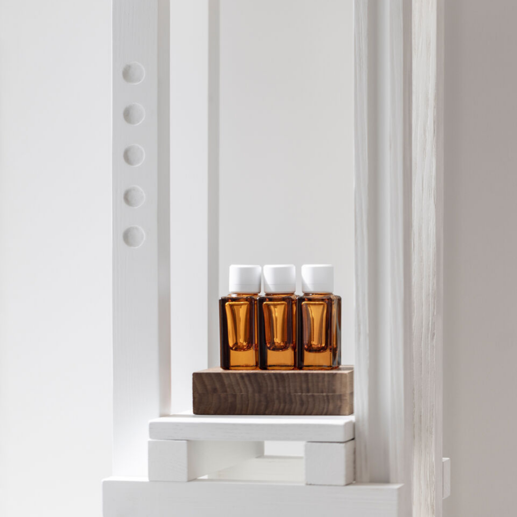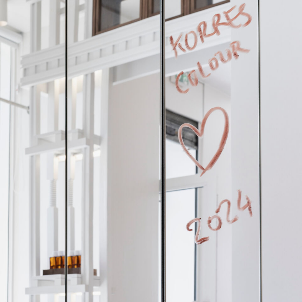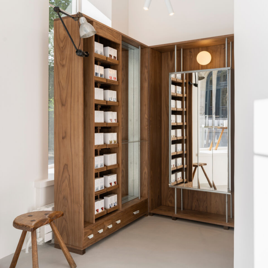 O design da loja se completa com um item único, um guarda-roupa estilo boudoir apresentado como um móvel híbrido projetado especificamente para o canto de maquiagem da Korres.