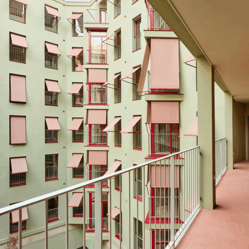 Estes são projetados pelo escritório para promover um senso de comunidade, com vista para o grande pátio semi-público em torno do qual a habitação está organizada.