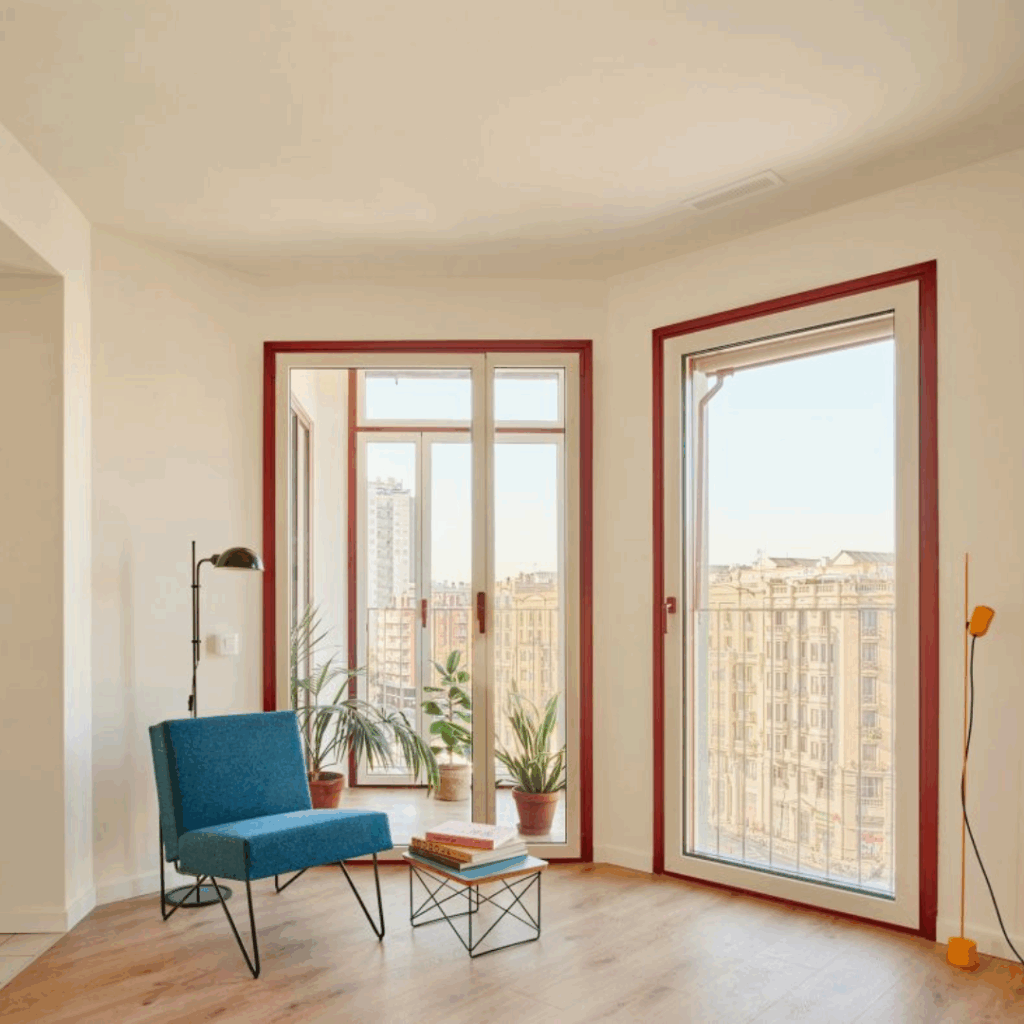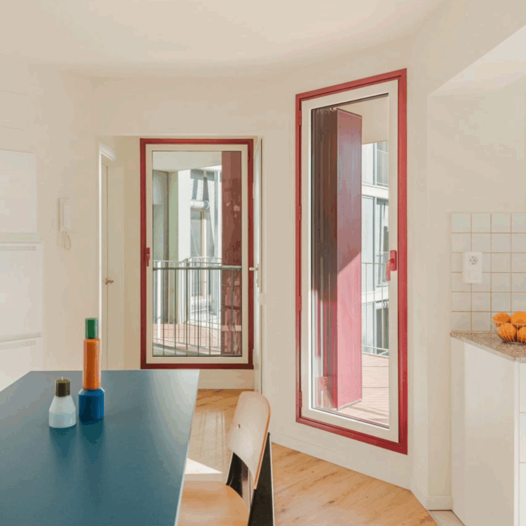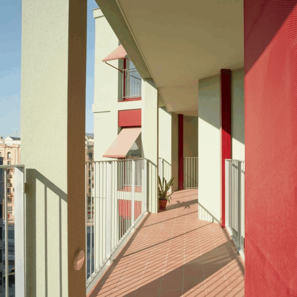 Apartamentos com quartos deliberadamente não definidos preenchem este bloco de habitação social em Barcelona, que o escritório local Cierto Estudio terminou com uma paleta de vermelho ousado e verde pastel.