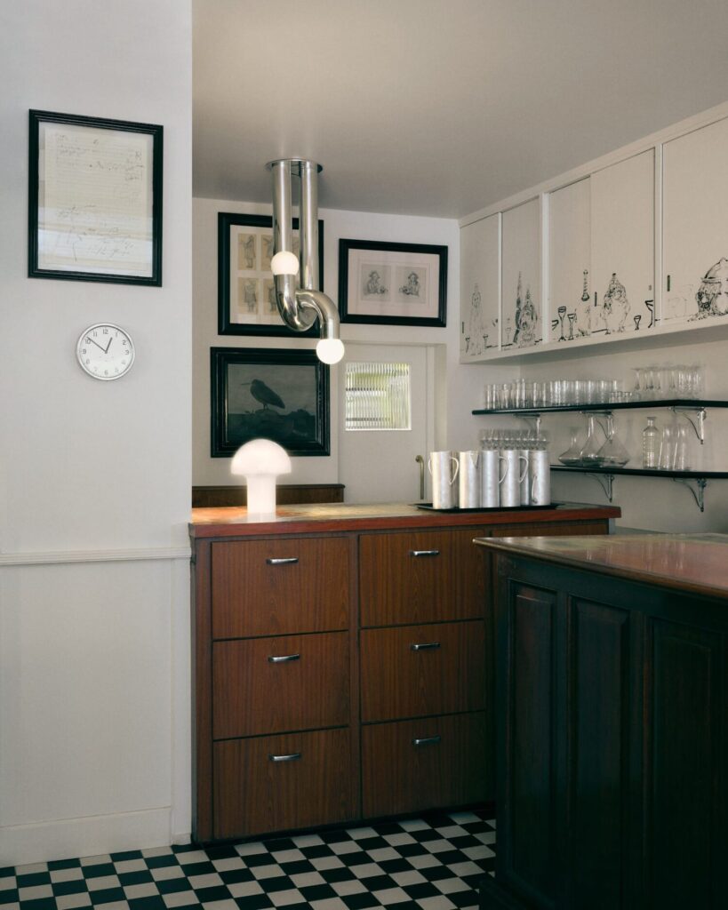 Seu trabalho também sobe pelas paredes, com linhas gravadas que se inspiram no estilo do tatuador enquanto brincam bem com os ossos da sala.