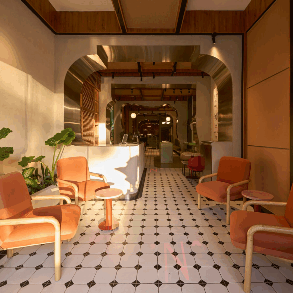 Elementos de mobiliário vintage são cuidadosamente dispostos por toda parte, adicionando textura e personalidade, ao mesmo tempo em que conectam suavemente as áreas do café e do varejo.