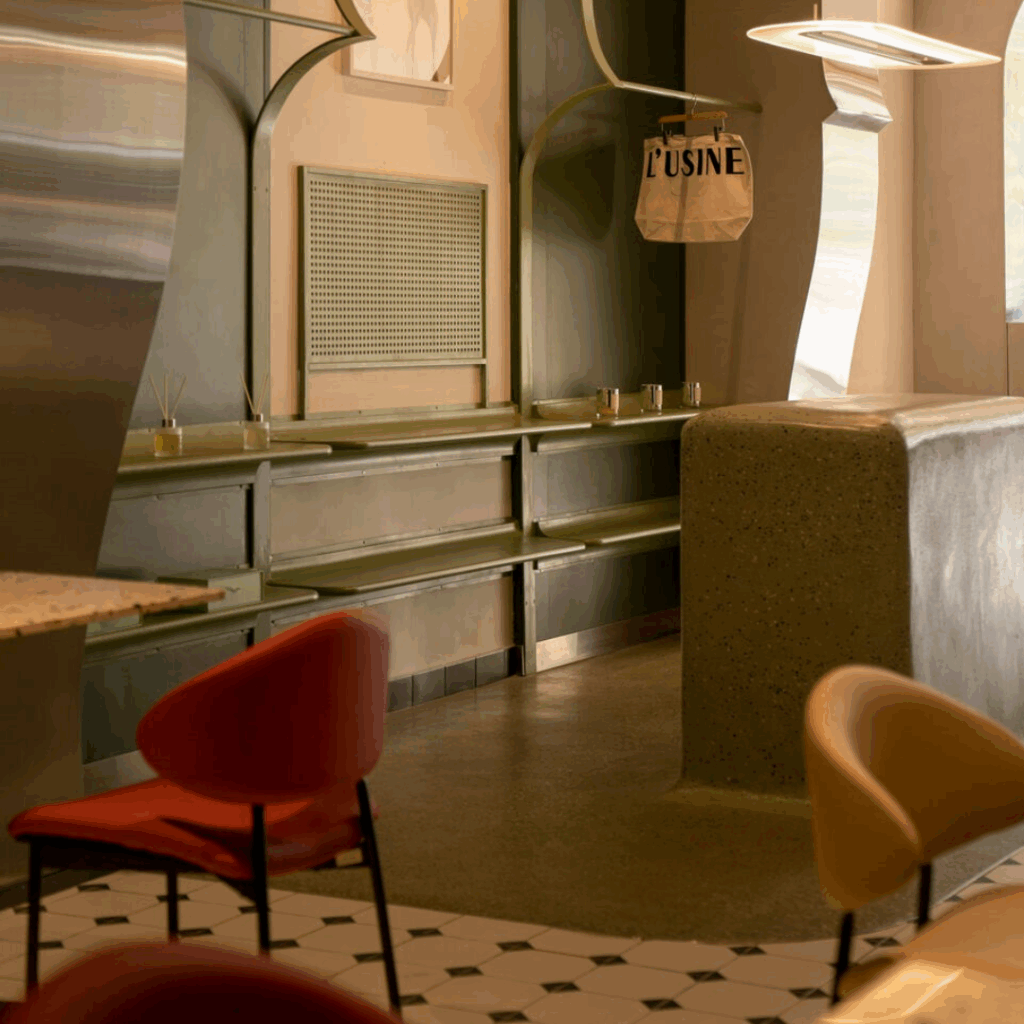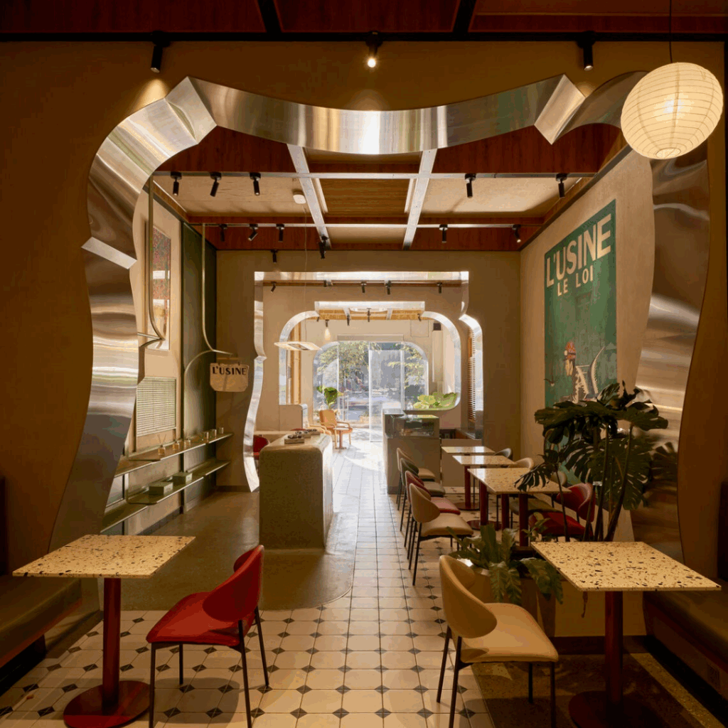 Além do café, o espaço transita suavemente para uma refinada área de varejo, onde os produtos exclusivos da L’Usine são expostos ao lado de peças artesanais de artesãos locais.