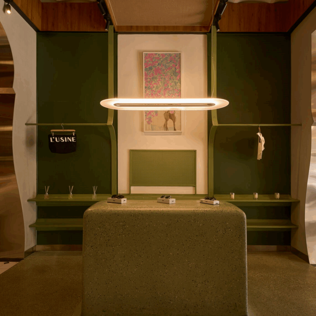 O espaço transita suavemente para uma refinada área de varejo, onde os produtos exclusivos da L’Usine são expostos ao lado de peças artesanais de artesãos locais.