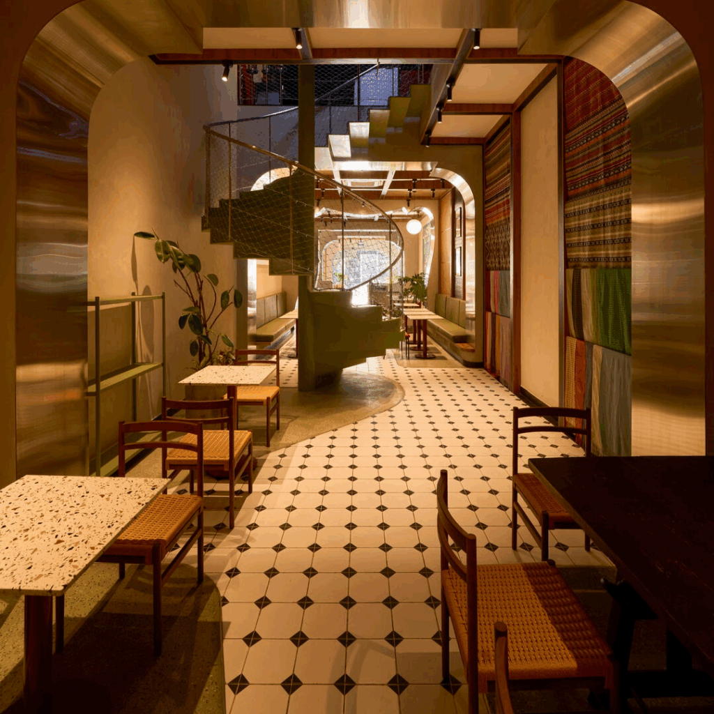 O design reinterpreta o histórico posto comercial, um local de troca de mercadorias, histórias e ideias, para a vida urbana atual, expressa por meio de uma mistura de café, área de varejo e espaço cultural.