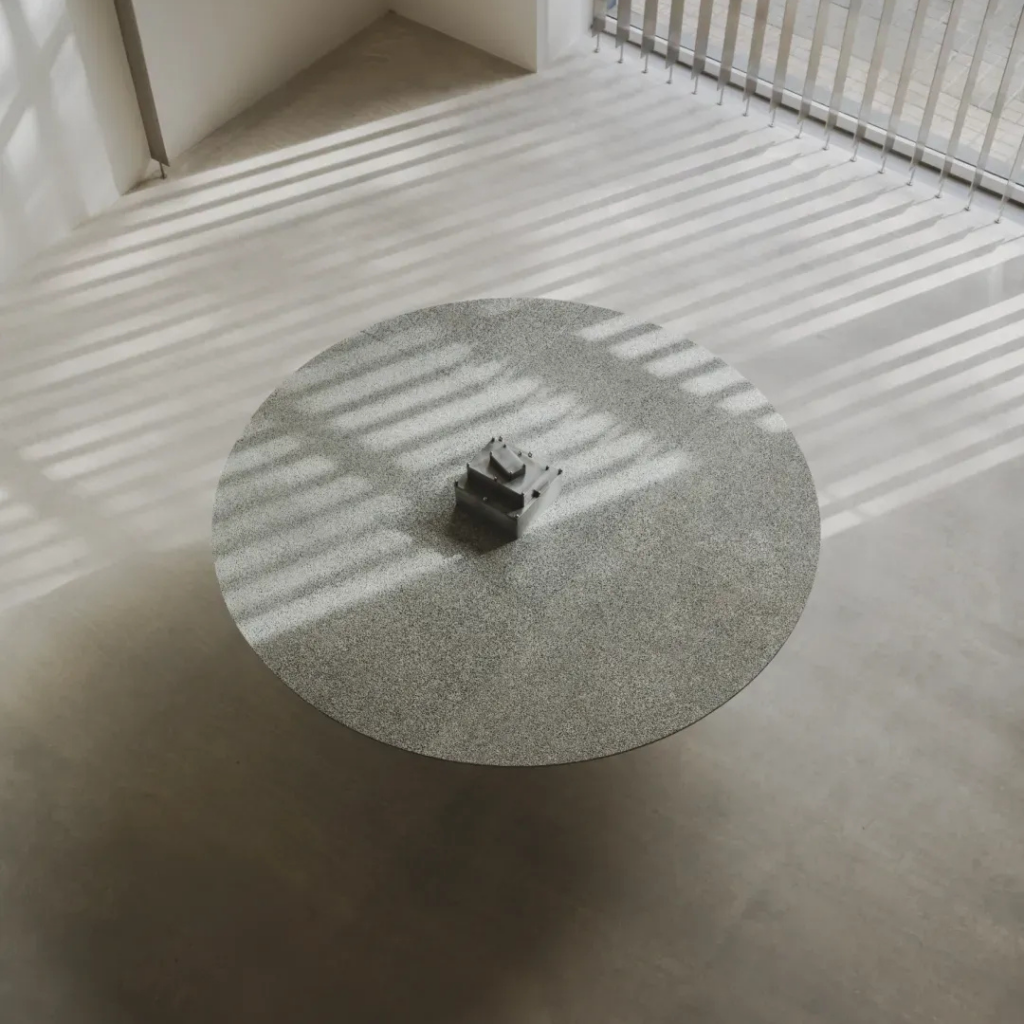 No interior, as Mesas de Relógio pontuam o espaço como relógios industriais, suas colunas únicas sustentando discos giratórios de terrazzo.