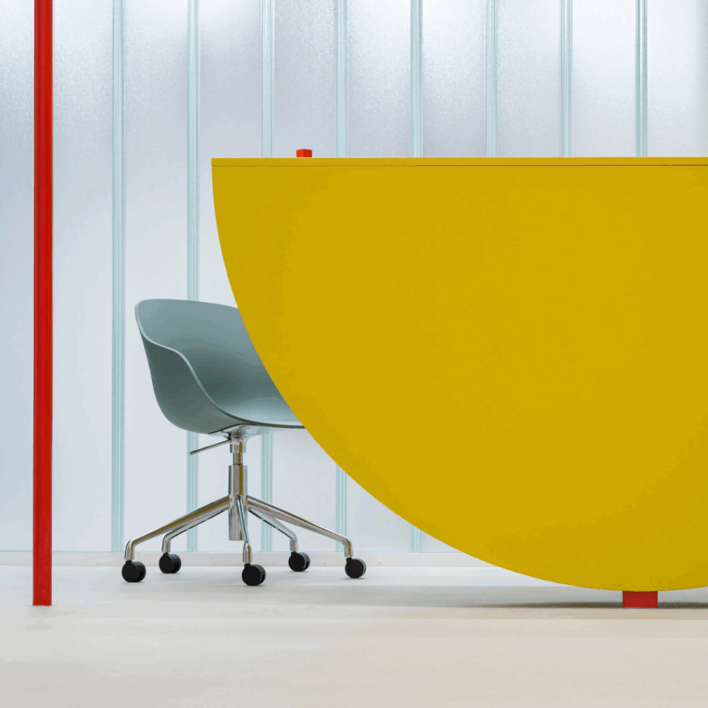 O volume cilíndrico da sala de reuniões forma um marco visual do espaço.