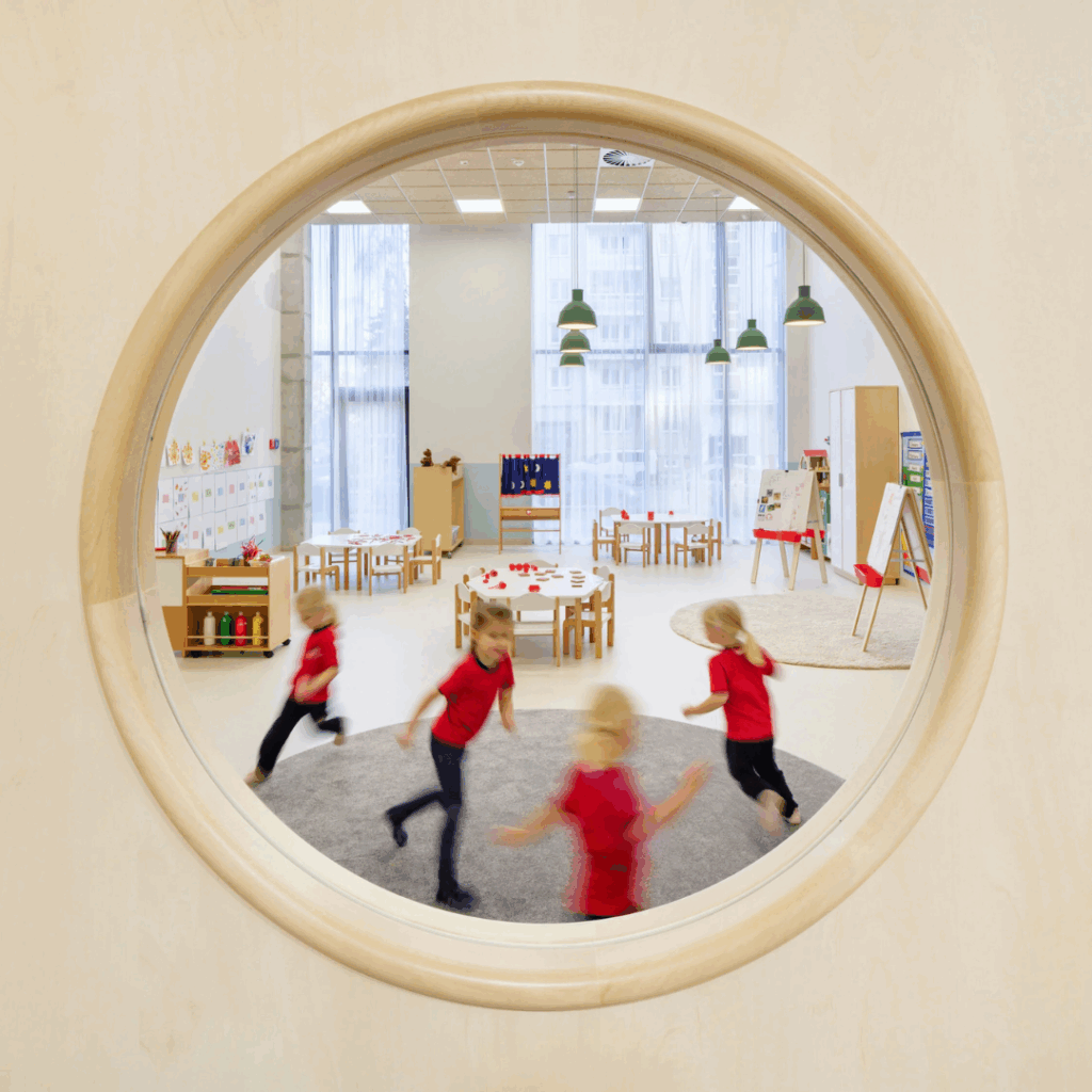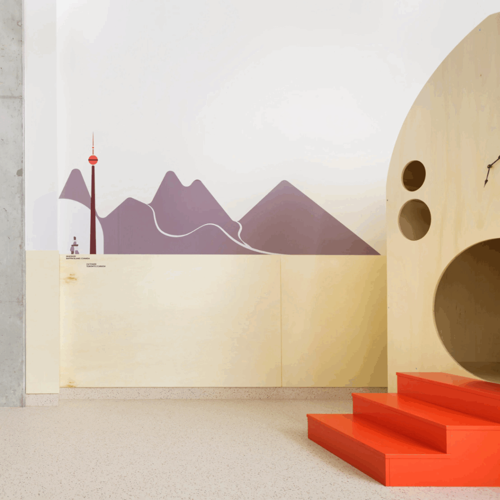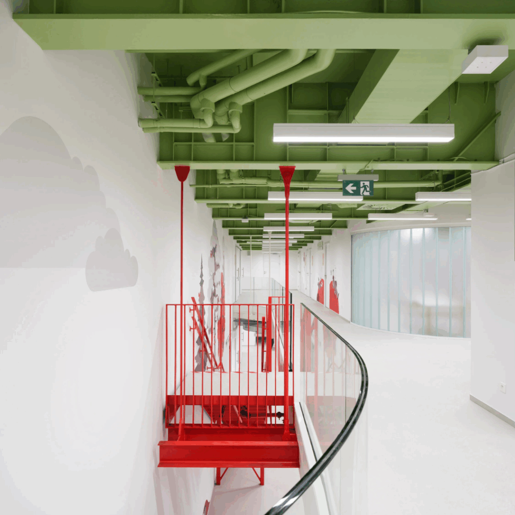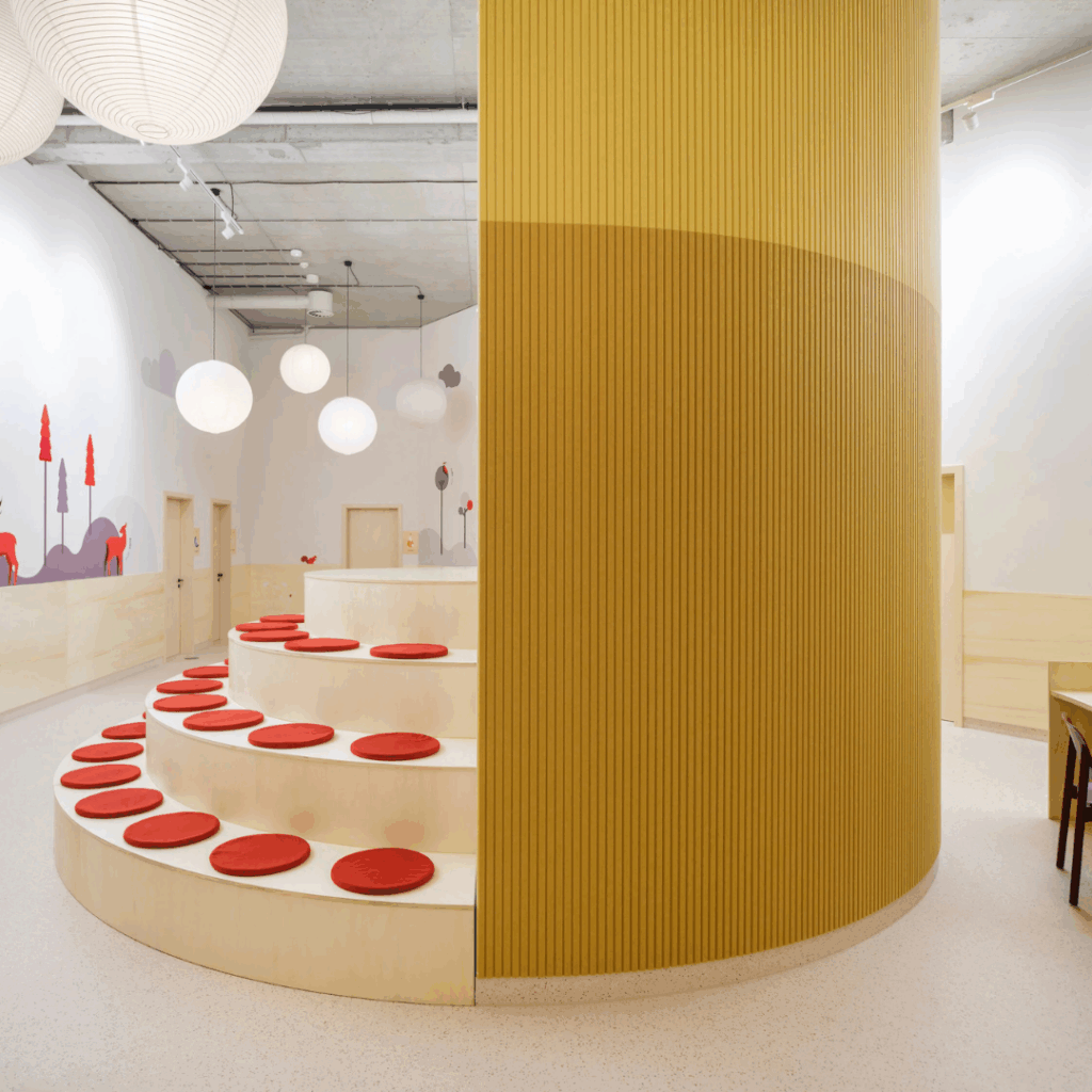 O layout do jardim de infância coloca as salas de aula no perímetro iluminado do edifício multifuncional do Olomouc BEA Centre, de modo que um espaço central, o corredor, esteja situado no meio.