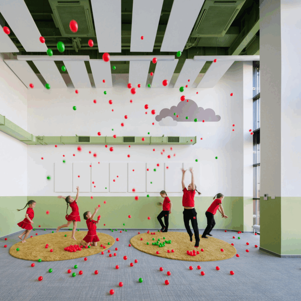 O saguão, um playground interno, um pequeno anfiteatro e uma área de estar descontraída com biblioteca e brinquedos foram colocados no salão.
