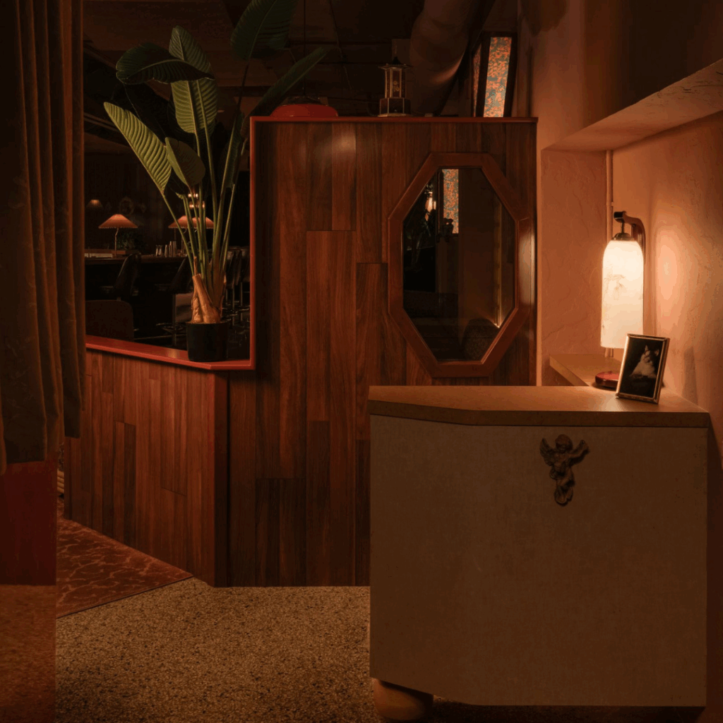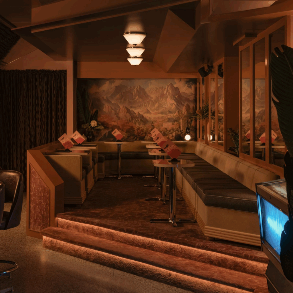 Esses elementos, combinados com os interiores monocromáticos rosa de pelúcia inspirados nas colchas de motel, criam um ambiente imersivo que transporta os hóspedes de volta no tempo