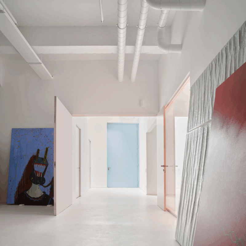 As obras de arte incluem um retrato de um gato persa encontrado em uma venda de garage e um mural impresso em vinil de uma fotografia tirada dentro de um hotel norte-coreano.