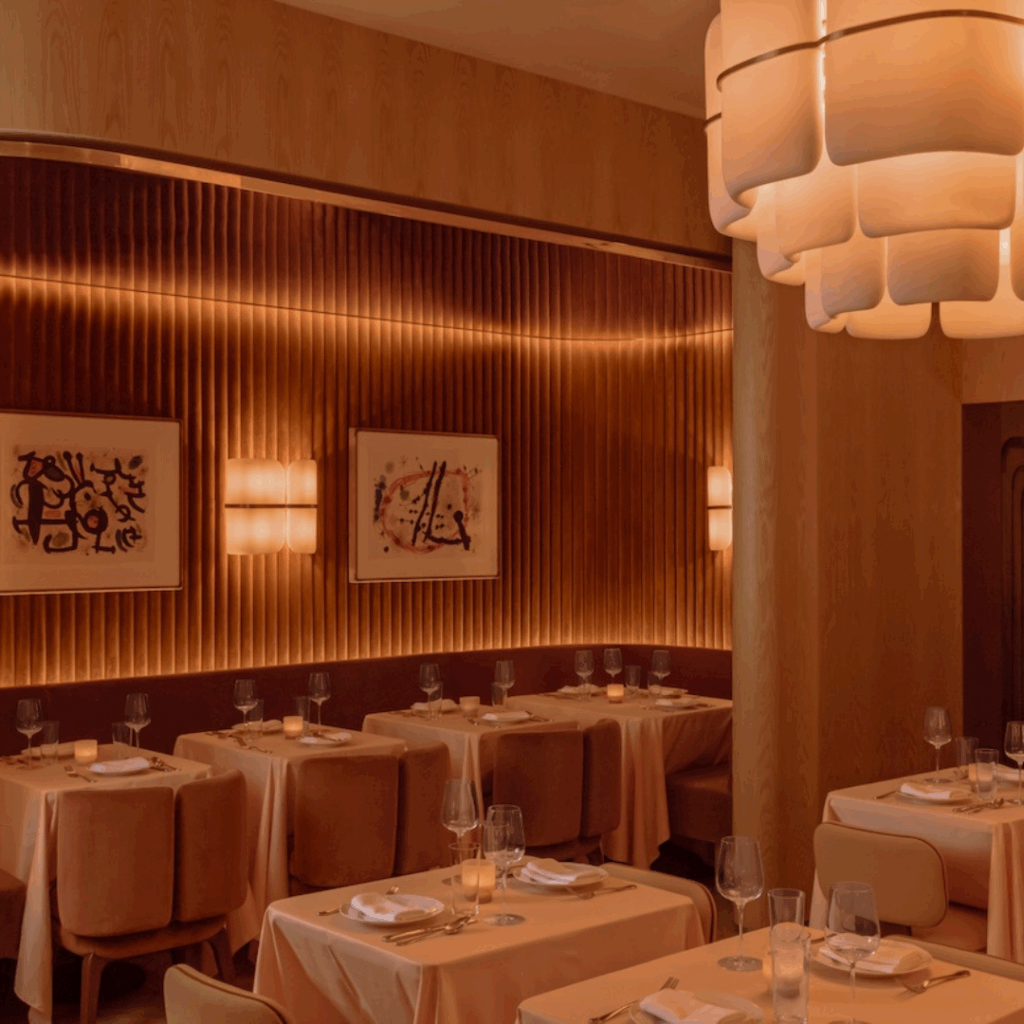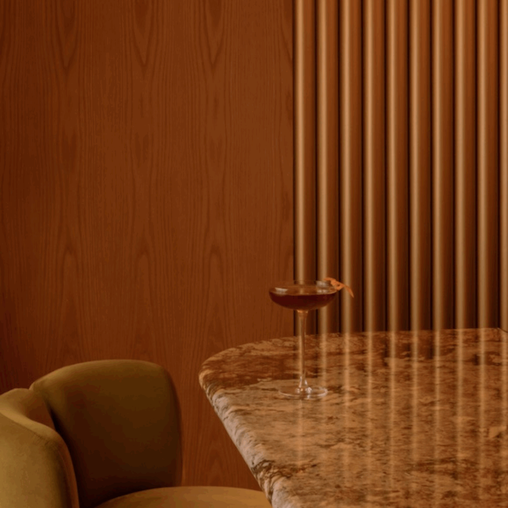O Marc Ange Design Studio criou um interior sensual em tons de caramelo, definido por paredes de veludo de junco, painéis curvos de nogueira e detalhes em nervuras douradas no bar.