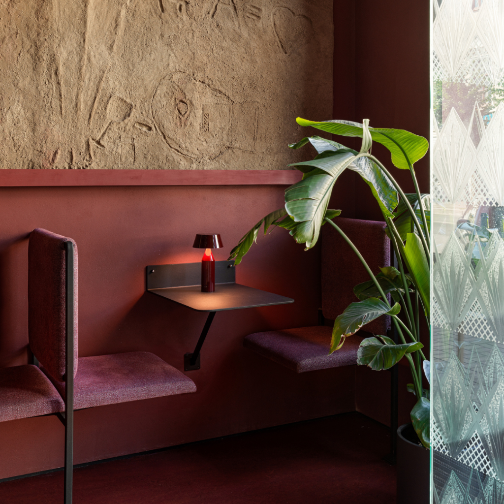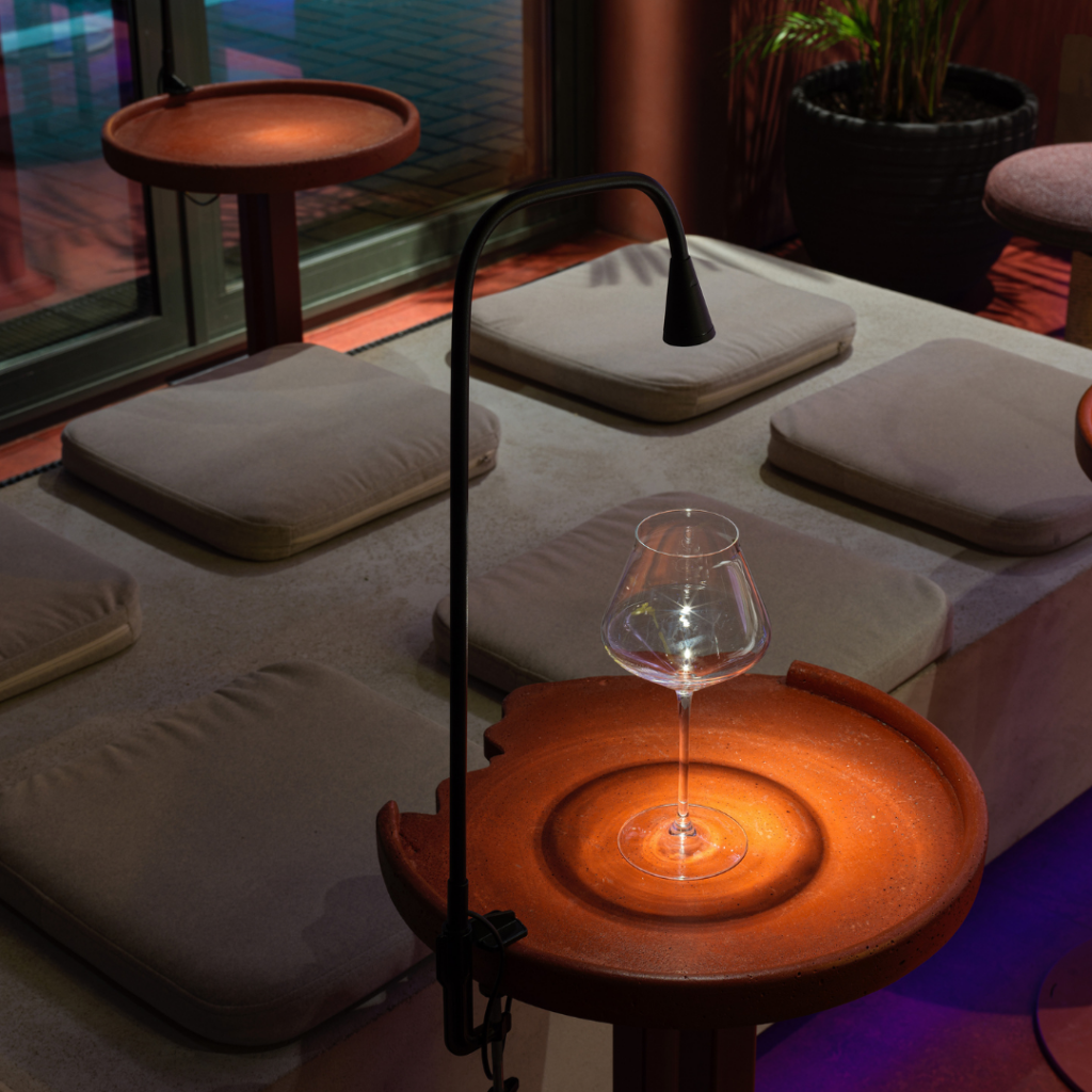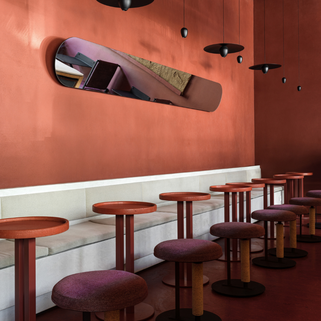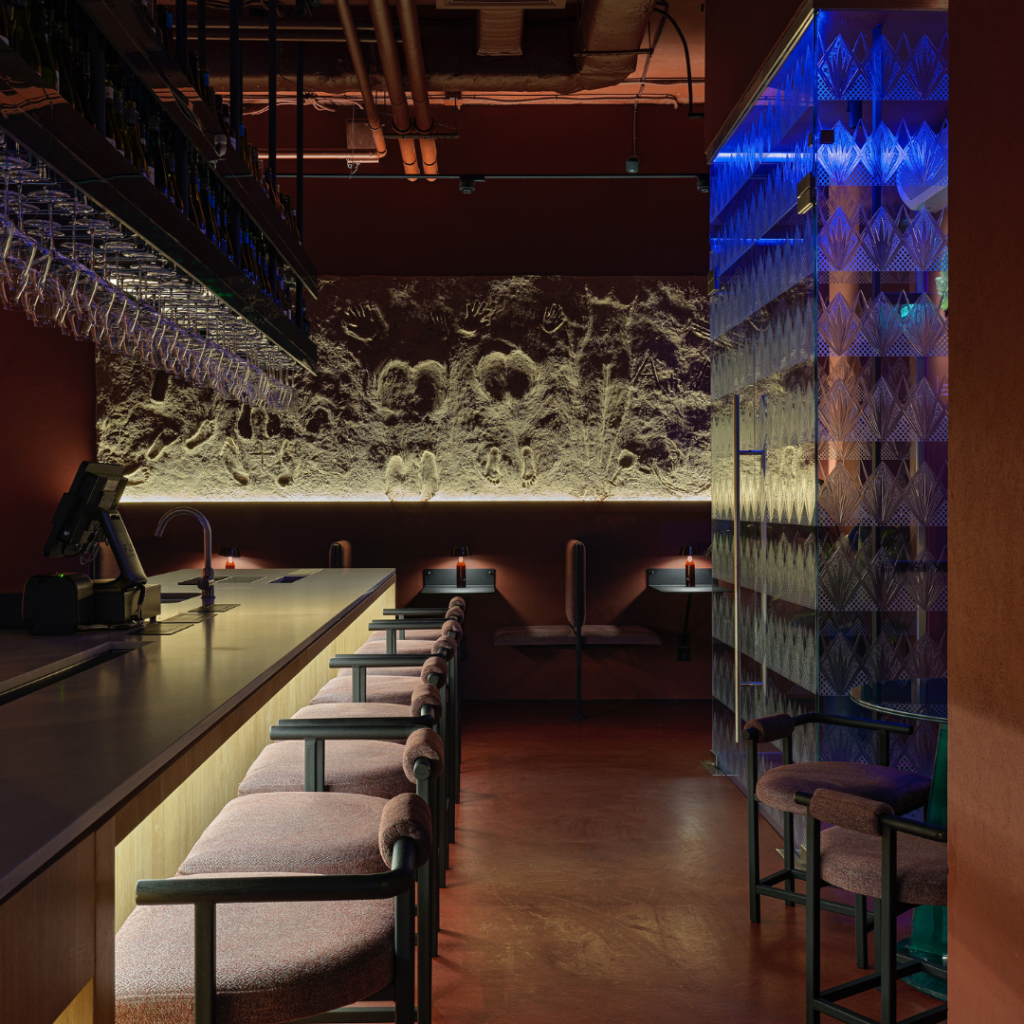 A atmosfera do bar muda de luminosa e acolhedora durante o dia para romântica à noite, e depois para um espaço dinâmico e carregado de emoções, realçado por iluminação colorida.