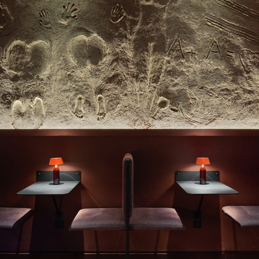 A iluminação de destaque destaca mesas de concreto com bordas “desgastadas” e barris de madeira, como se estivessem escondidas atrás de uma porta de porão.